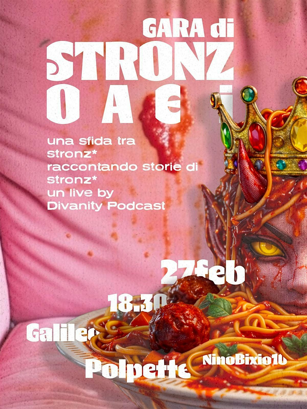Divanity Podcast organizza il primo Concorso de* Stronz*. Un incontro goffo dove le persone in gara racconteranno le proprie gesta più meschine e chi assiste deciderà chi merita il titolo — ovvero chi si aggiudica la corona di Re o Regina della Stronzaggine.
