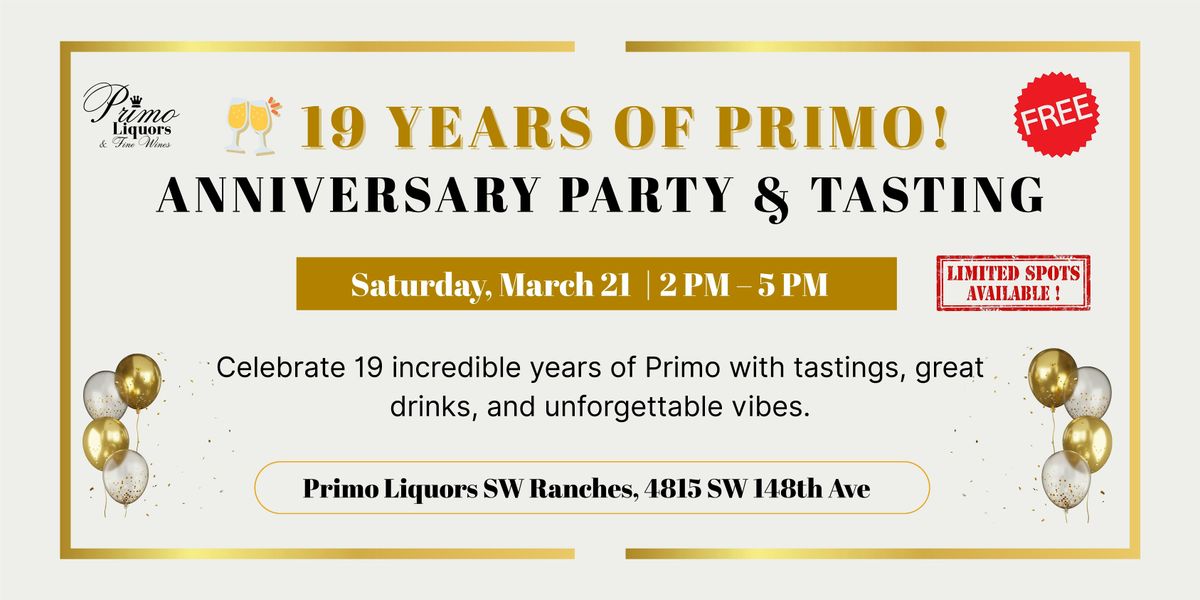 Celebrate 19 incredible years of Primo Liquors with a special anniversary tasting event. Join us for an afternoon featuring curated tastings, featured brands, and a welcoming social atmosphere.