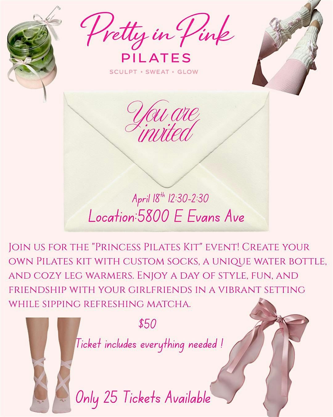 Pilates, matcha & cute custom kits April 18 | 12:30–2:30 | $50 ✨ Only 25 spots! Grab your girls & join the vibe DM “PINK” to book