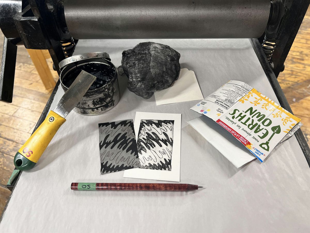 Tetrapak printmaking is an acid free and non-toxic process where we reuse cartons such as juice boxes, protein shakes, soup stock, oat milk, etc. as the plates to create prints. There are a number of ways to inscribe marks into this surface to create your image. Differene line weights can be achieved in this method, from very fine to thick and bold, to create nice flowing imagery with an etching needle. Solid tone can also be achieved by simply peeling away the metallic coating. Once the plate is complete, force ink into the recesses of the plate, wipe off the excess from the top surface and run it through an intaglio press against a sheet of dampened paper.