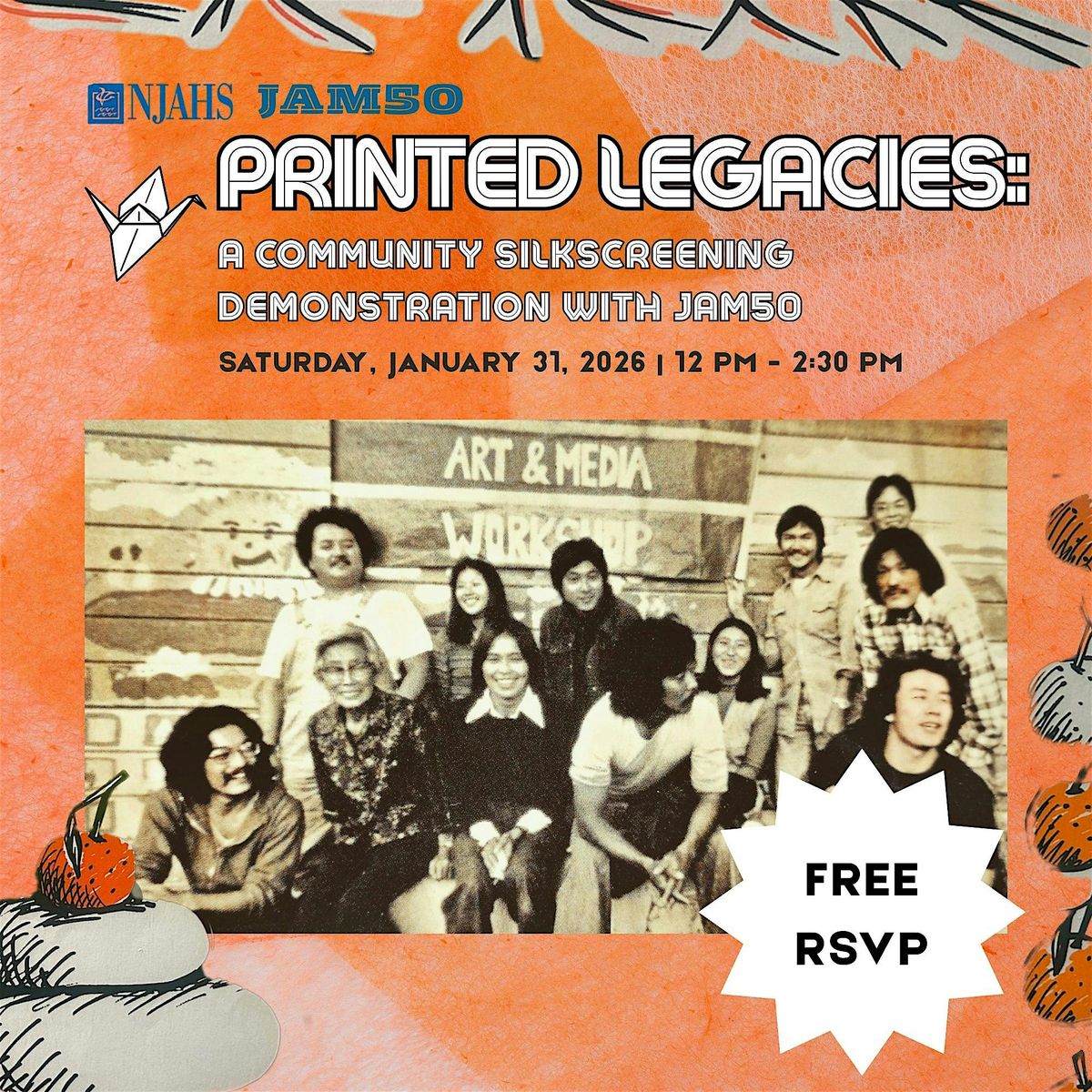 Join JAM50 at NJAHS for a silkscreening program centered on passing tradition from one generation to the next. The first half of the event will feature a live silkscreening demonstration, offering insight into the history, techniques, and cultural significance of the practice. In the second half, participants will take part in a guided takeaway silkscreen activity, creating a printed piece to bring home. Together, we’ll celebrate printmaking as a living tradition—one sustained through shared knowledge, creativity, and collective memory.