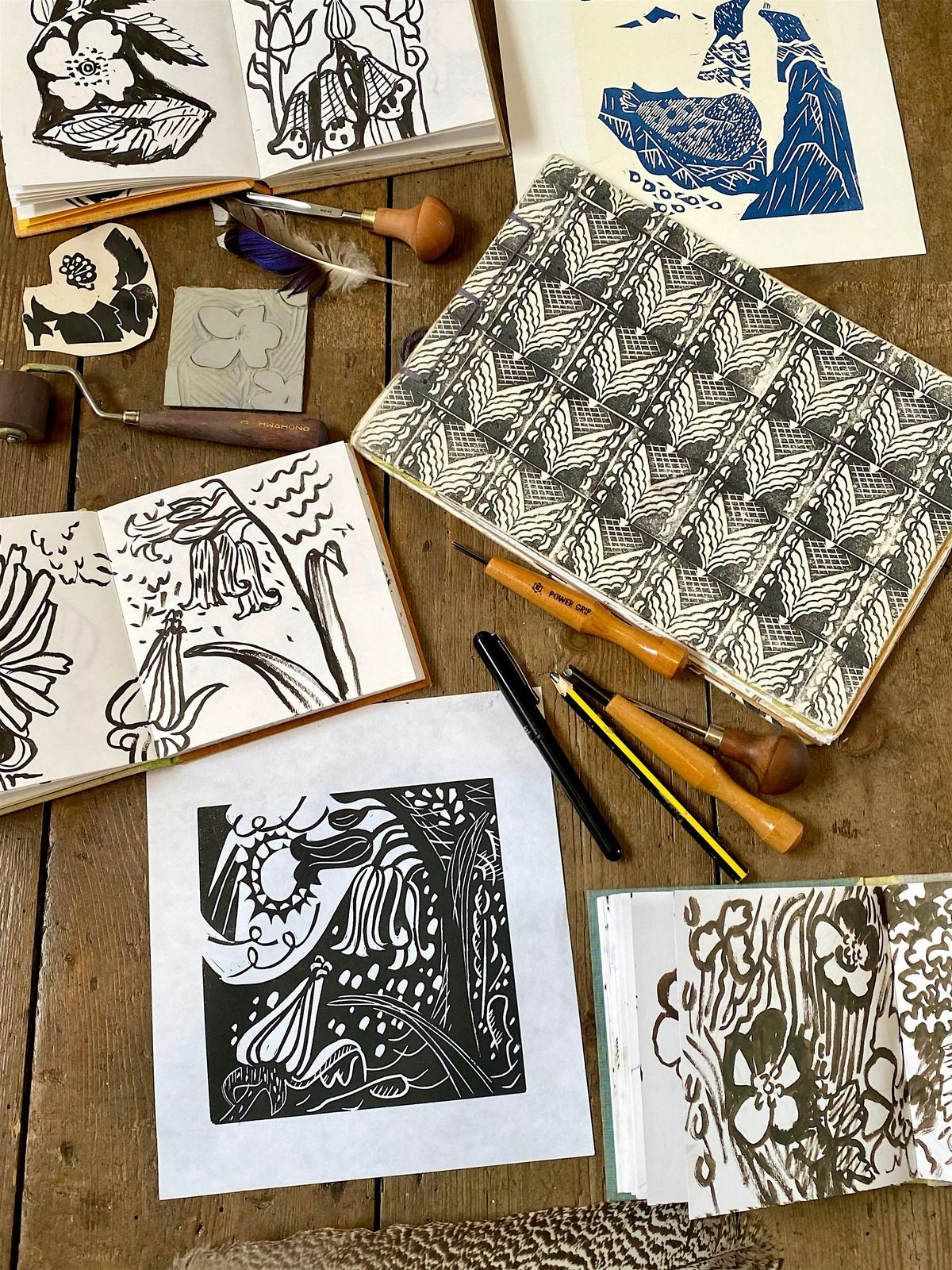 This workshop is perfect for creative people of all levels that want to learn how to develop ideas for all the various types of printmaking. Participants will learn how to draw using line, pattern and silhouette, getting creative and sometimes messy! There will be linocut and monoprint and expressive drawing. You will go away with some gorgeous sketchbook pages, small scale print experiments and ideas for your future as a printmaker.