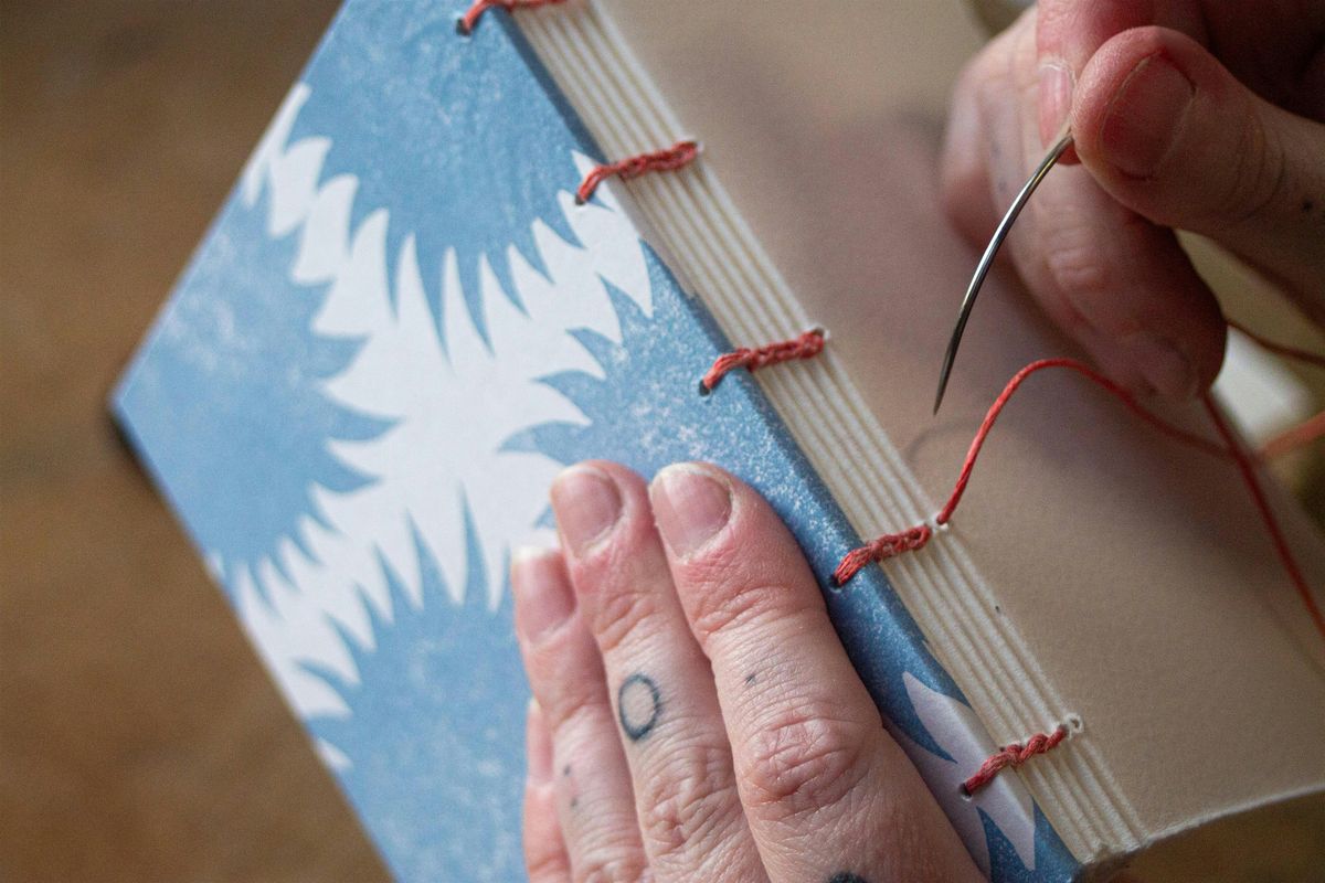 Working alongside printmaker () learn how to carve intricate Lino blocks with traditional tools and print beautiful repeated patterns. Participants will use the block printed papers to make covers for an A6 Coptic Bound book with bookbinder who will teach you how to hand sew and bind a wonderful lay-flat notebook/sketchbook.