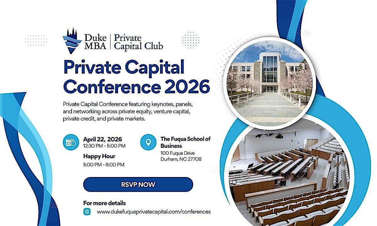 We are pleased to invite you to the Duke MBA Private Capital Conference, hosted by the Private Capital Club at Duke University’s Fuqua School of Business. The conference will take place on April 22, 2026, and will bring together students, investors, and industry professionals for an afternoon of discussions on private equity, venture capital, private credit, real estate, and emerging trends in private markets.