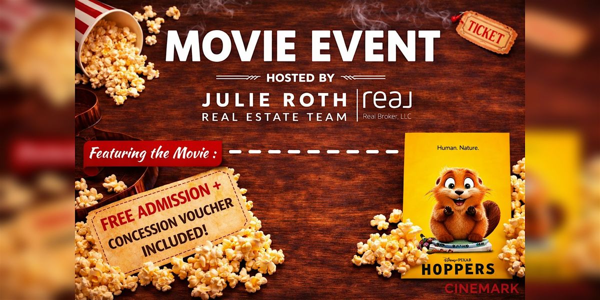Private VIP Movie Day! See Hoppers with Julie Roth Real Estate on April 12. Doors 11:30, movie at 12. Ticket + concession voucher included.