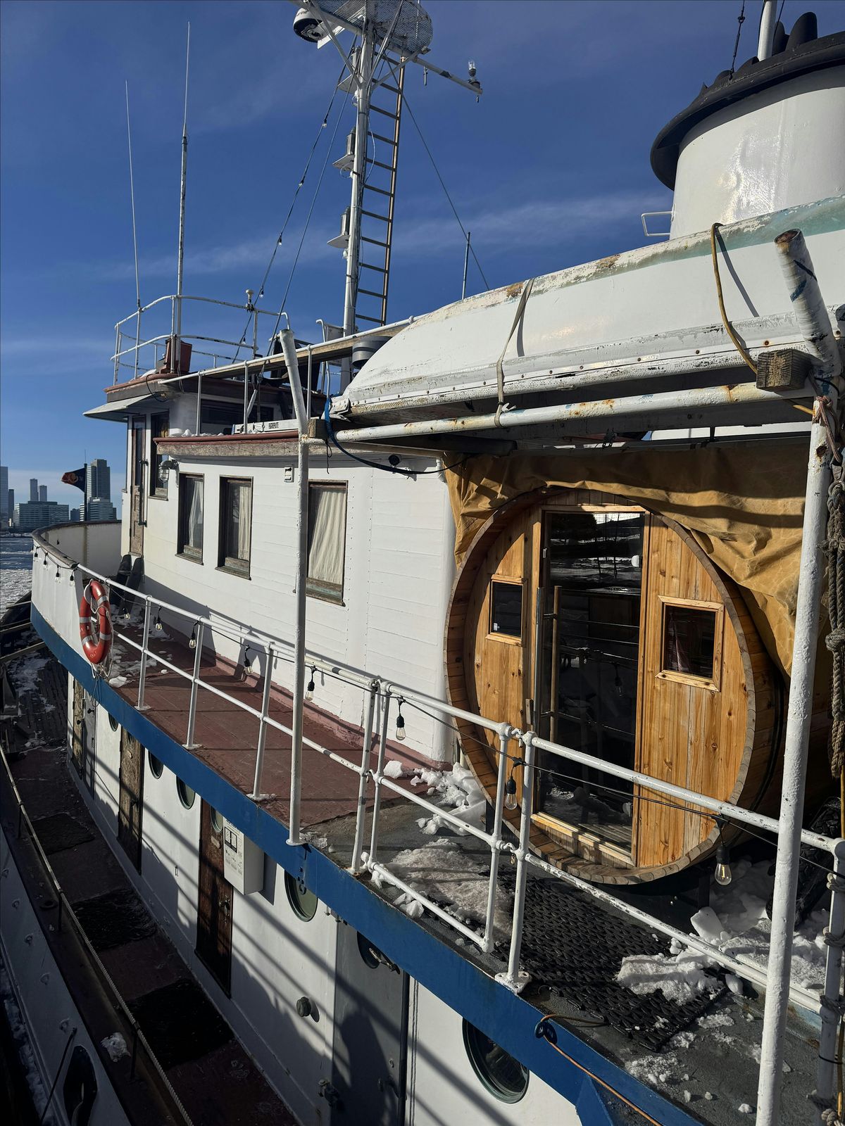 Experience a unique blend of history and relaxation aboard our historic ship! Our onboard private barrel sauna, infused with soothing aromas like eucalyptus, lavender, and rosemary offer a tranquil escape from the everyday. After warming up in the sauna, refresh with our convenient on-ship shower. Gather your things and enjoy a hot cup of tea by the wood burning stove before you depart. It’s the perfect way to unwind and immerse yourself in maritime history, all while enjoying views from the water of the Hudson River, Tribeca, and Financial District neighborhoods. Book your experience today and settle into serenity!