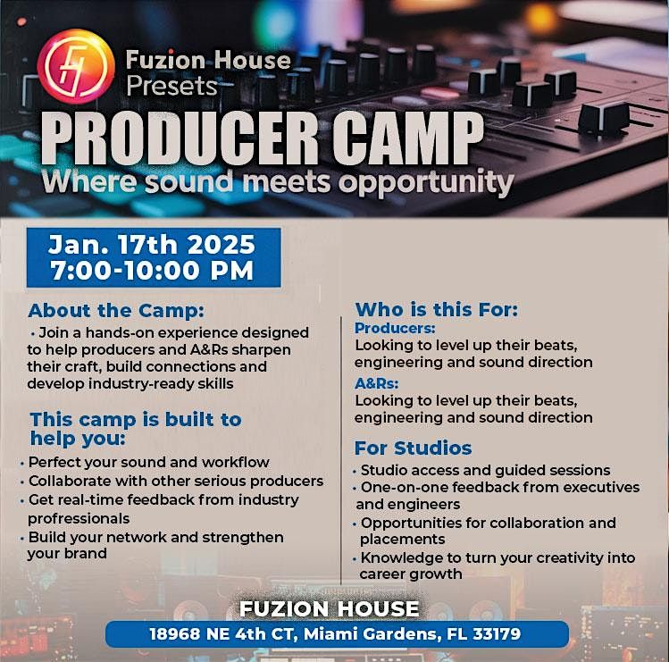 Hosted at Fuzion House, this camp brings together serious creatives in a studio-driven environment focused on collaboration, growth, and real-world feedback. Attendees will gain insight into production techniques, engineering, sound direction, and how to position themselves for long-term career growth.