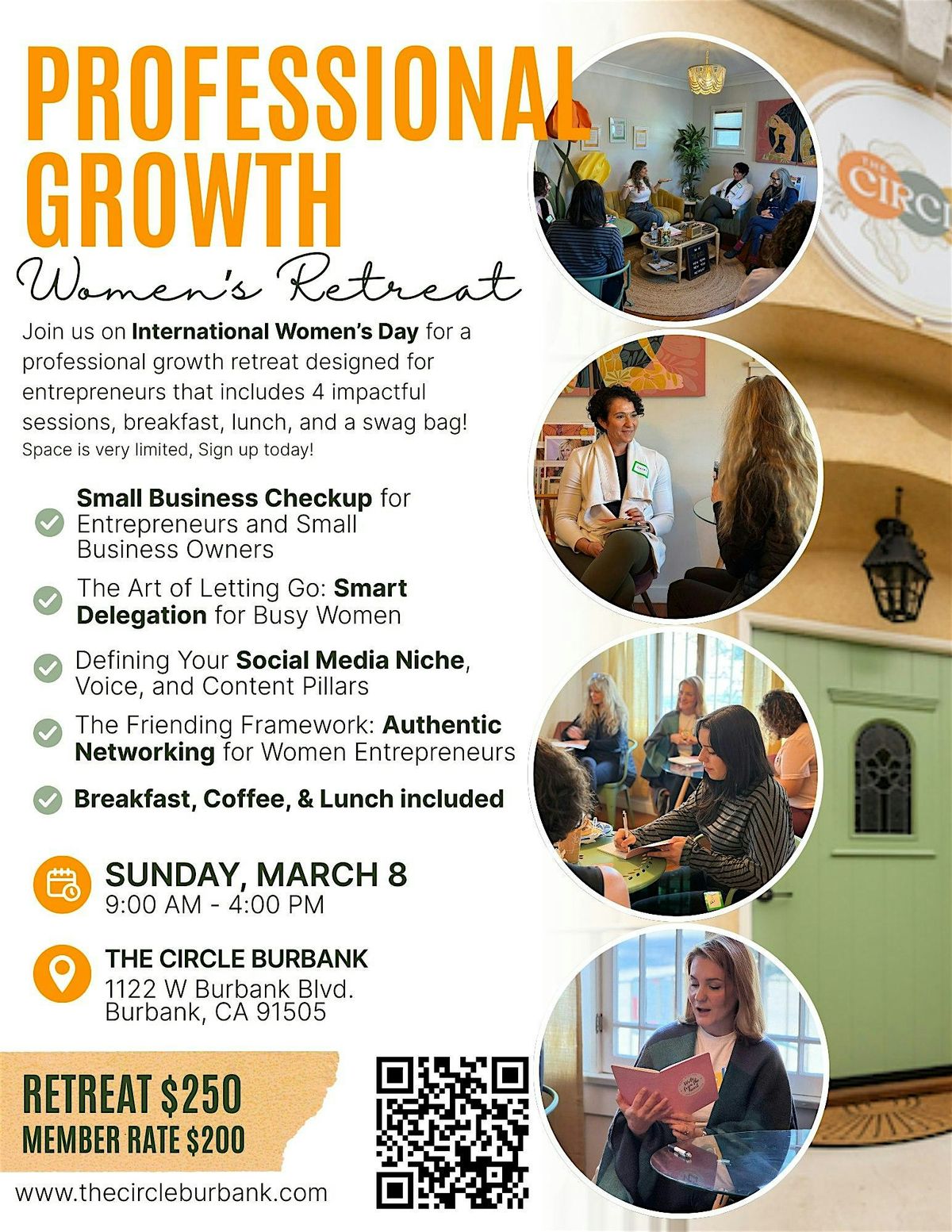 Join us on International Women’s Day for a professional growth retreat designed for entrepreneurs that includes 4 impactful sessions, breakfast, lunch, and a swag bag!