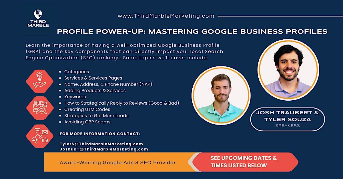 Welcome to an event where you'll learn how to maximize the potential of your Google Business Profile! Join us for a hands-on workshop designed to boost your online presence. Discover the strategies and tips that will make your business stand out on Google. This event is your opportunity to power up your profile and attract more customers. Get ready to master the art of optimizing your Google Business Profile like a pro!