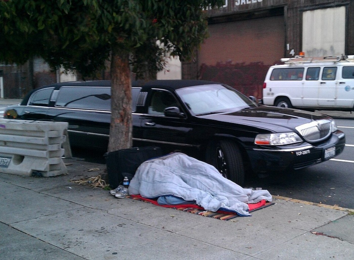 Image: A limousine parked by a homeless person in San Francisco’s Mission District. (Photo by Shani Heckman / Wikimedia Common.)
