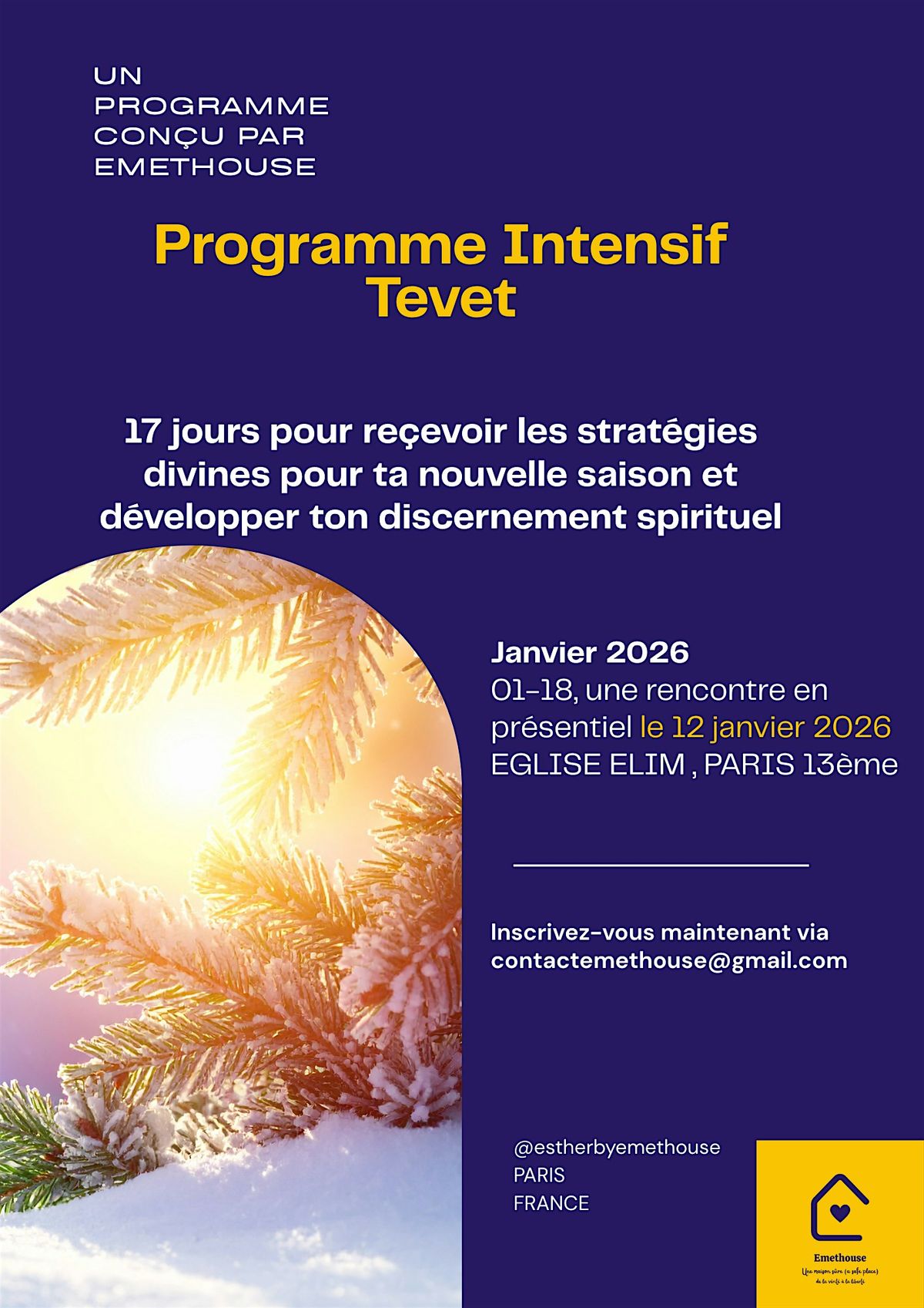 Viens vivre une expérience unique pour renforcer ta foi en cette période hivernale : comprendre le mois de Tevet, ce qu'il implique spirituellement pour toi et recevoir les stratégies divines pour ta saison mais aussi développer son discernement spirituel. Au programme : prières, méditations de la parole de Dieu, encouragements quotidiens et proclamations puissantes.