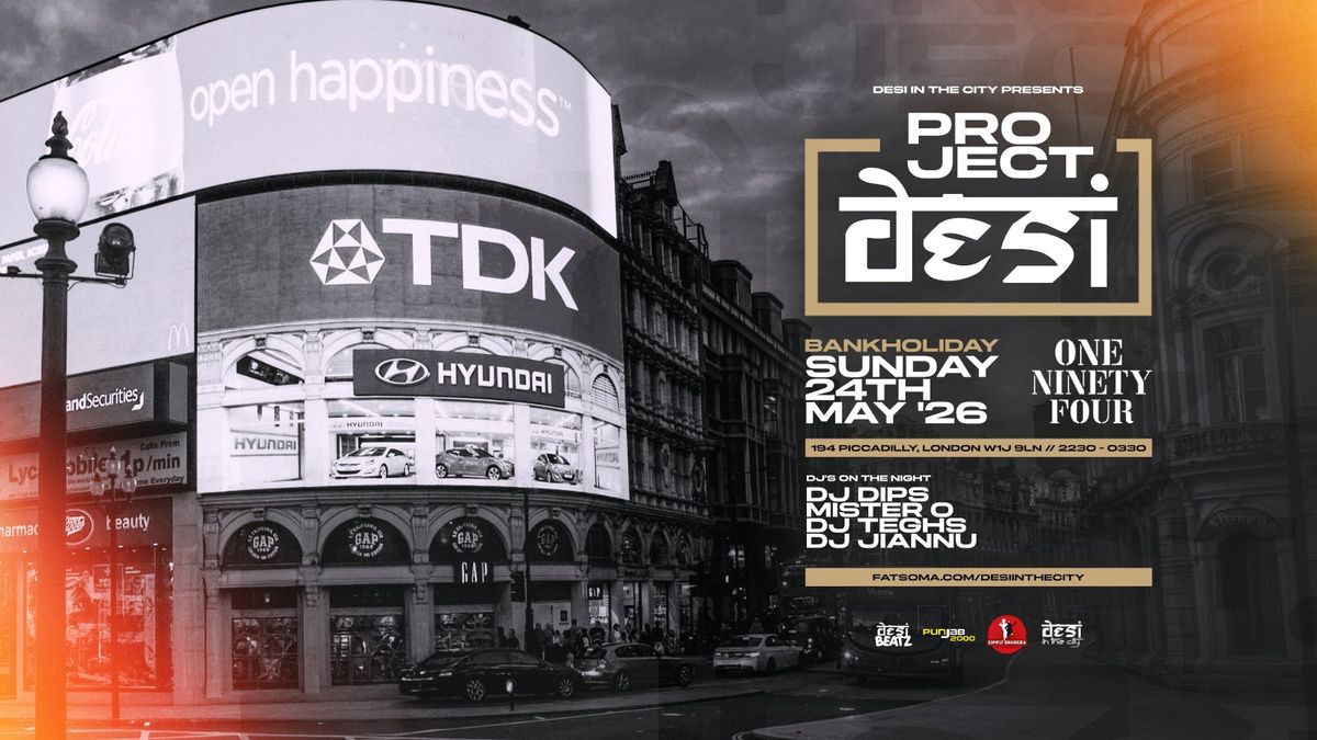 Desi In The City presents PROJECT DESI@ One Ninety Four, 194 Piccadilly.BANK HOLIDAY SUNDAY 24TH MAY 20261O.30PM - 3.30AM (LAST ENTRY 00.30AM!)Desi In The City presents an exclusive, limited capacity event focused on PURE Bhangra, Panjabi & Desi Anthems!Expect the musical vibes you've been dying for in an intimate setting featuring incredible production & like-minded party goers celebrating the golden era of Panjabi music & culture! We've handpicked the stunning 'One Ninety Four', a 500 capacity multi-faceted events space in the heart of the West End which boasts vip booths, state-of-the-art lighting & incredible bass thumping sound!