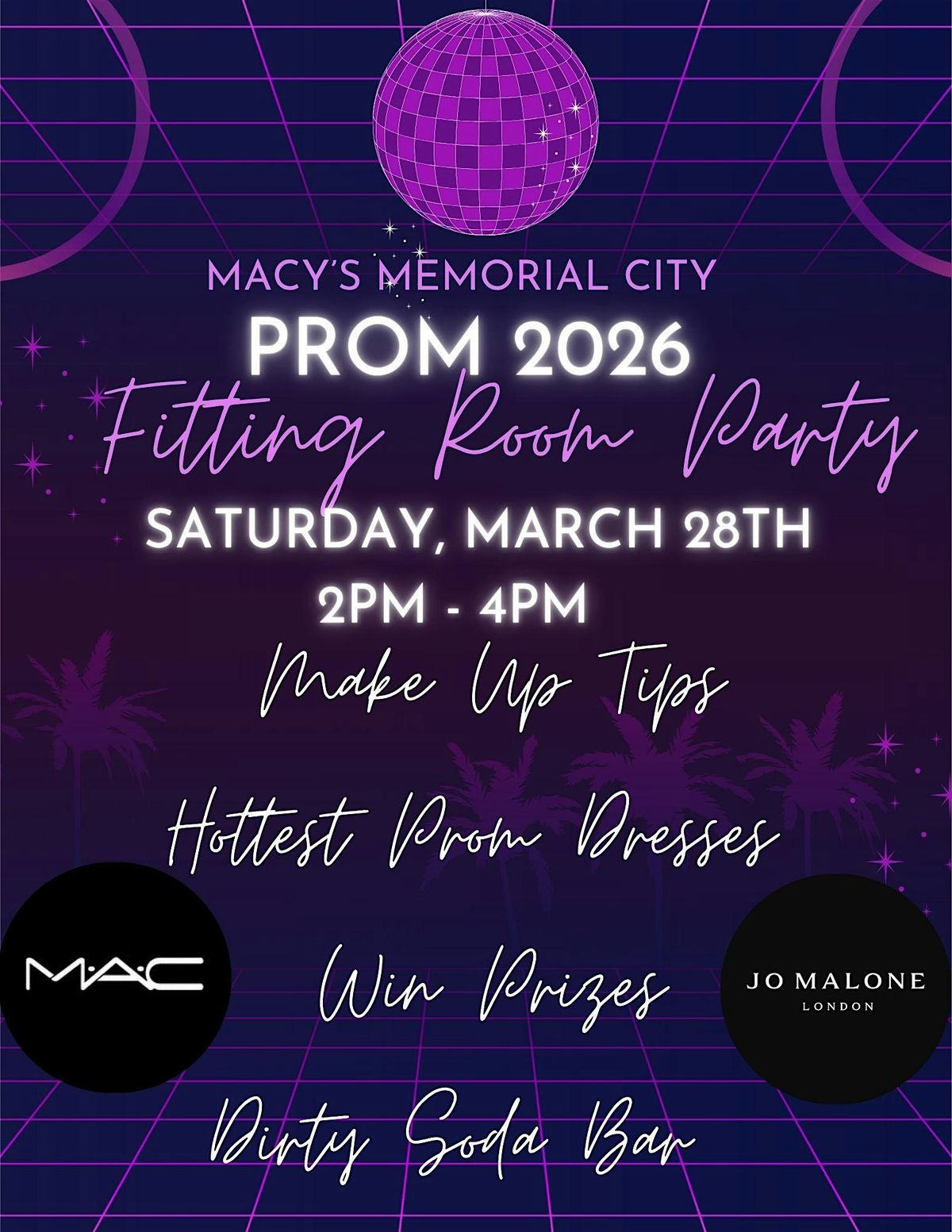 Join us in person at Macy's Memorial City for a fun-filled fitting room party. It's the perfect chance to try on your prom outfits, hang out with friends, and get excited for the big night. Make up tiops from MAC for the perfect look for your BIG night! aJo Malone for the 1st 25 party goers who try on! Stop by our Dirty Soda Shop with sips & treats! Don’t miss out on this awesome event where style meets good vibes. See you there!