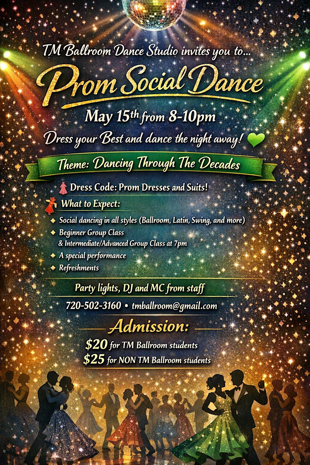 Step back into the magic of prom night—ballroom style! Join us for a glamorous Prom-Themed Social Dance Party where you can dress to impress, dance under the “stars,” and enjoy an evening filled with elegance and fun. We’ll set the mood with classic prom décor, beautiful lighting, and a mix of romantic slow dances, lively Latin rhythms, and all your favorite ballroom styles.