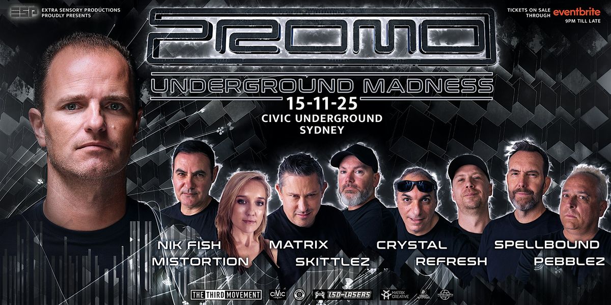 Saturday 15th November 2025 at the Civic Underground, PROMO will be bringing us “Underground Madness” from 9pm alongside Sydney’s own Nik Fish, Spellbound, Matrix, Crystal Mistortion, Skittlez, Refresh and Pebblez.