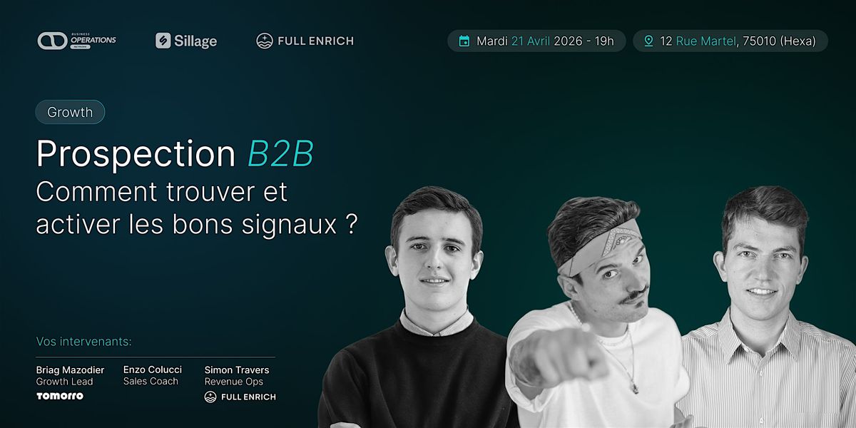 Briag Mazodier (Growth Lead chez Tomorro), Enzo Colucci (Sales Coach) et Simon Travers (Revenue Ops chez FullEnrich) partageront leurs approches concrètes terrain :