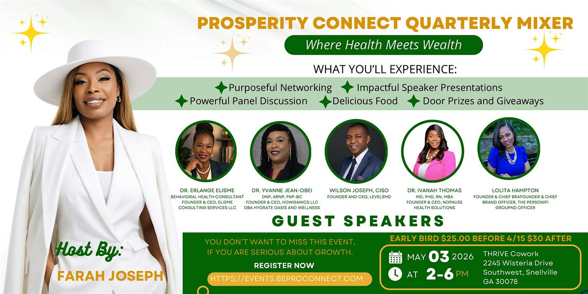 Join us for the next Prosperity Connect Quarterly In-Person Mixer, an inspiring afternoon designed for entrepreneurs, professionals, and growth-minded leaders who believe success should include both health and wealth.