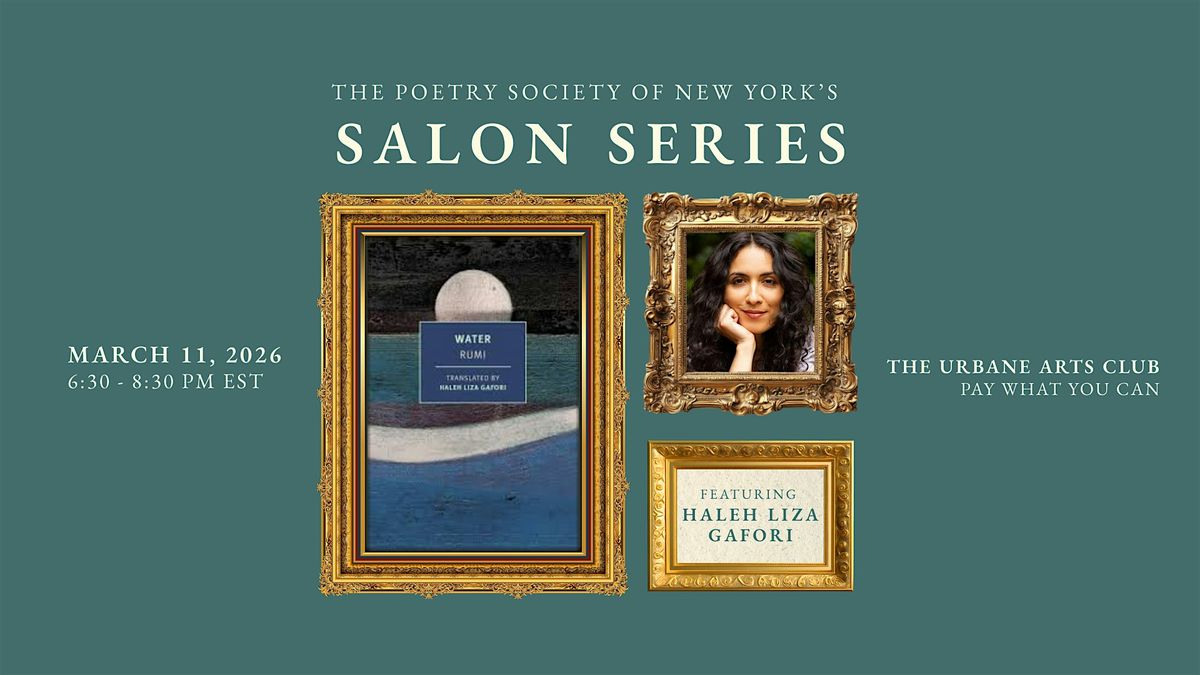 The Poetry Society of New York's Salon Series aims to create a sanctuary where writers and literature lovers can meet, mingle, think, feel, indulge, discuss, listen, learn, and live life to its fullest! Each Salon serves as a celebration of an esteemed poet's new release, consisting of a 20-30 minute reading followed by a Q&A and a book signing, with a complimentary open bar throughout. Admission is pay what you can. Previous Salons have celebrated the launch of Jericho Brown's The Tradition, Ariana Reines' A Sand Book, and Dorothea Lasky's The Shining. Readings begin at 7:30pm. Cocktail attire is encouraged but not required. This event's featured reader is Haleh Liza Gafori, & copies of Water will be available for purchase at the Salon courtesy of Taylor & Co Books.