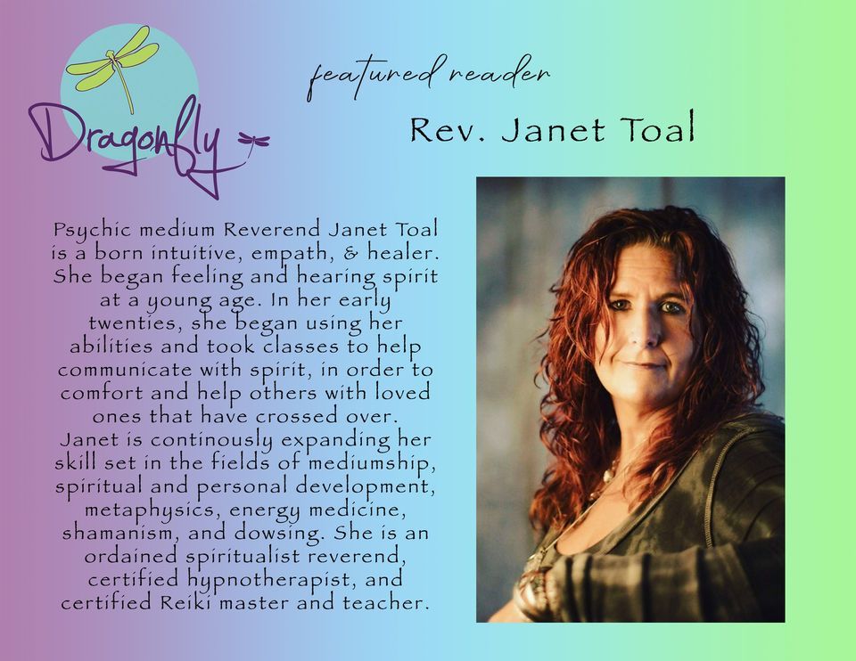 Rev. Janet Toal will be available for private readings at Dragonfly Art & Soul on To reserve your space, please call