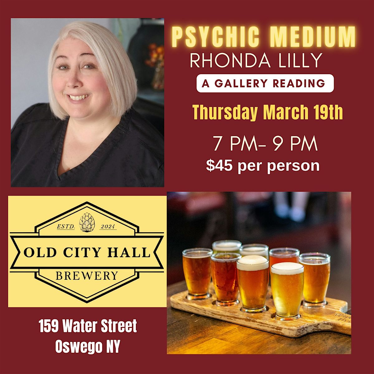 Get ready for an unforgettable evening with Psychic Medium Rhonda Lilly at the cozy Old City Hall Brewery! Join us in person for some mind-blowing insights and spiritual connections. Whether you're curious or a believer, Rhonda's warm and welcoming vibe will make this night truly special. Come hang out, connect, and maybe even discover something new about the unseen world!