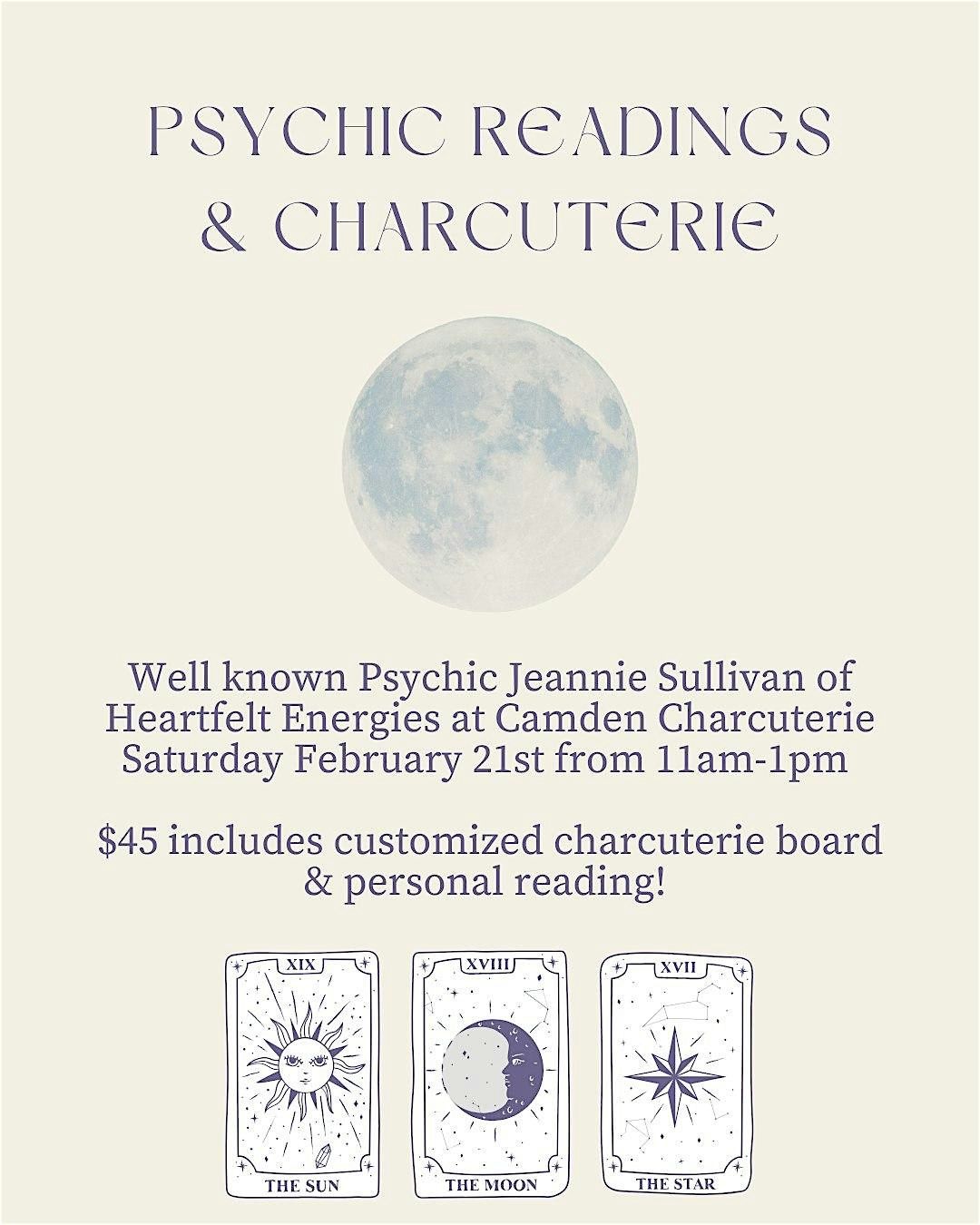 Psychic Jeannie Sullivan at Camden Charcuterie Saturday February 21st from 11am-1pm. Includes customized charcuterie board & reading!