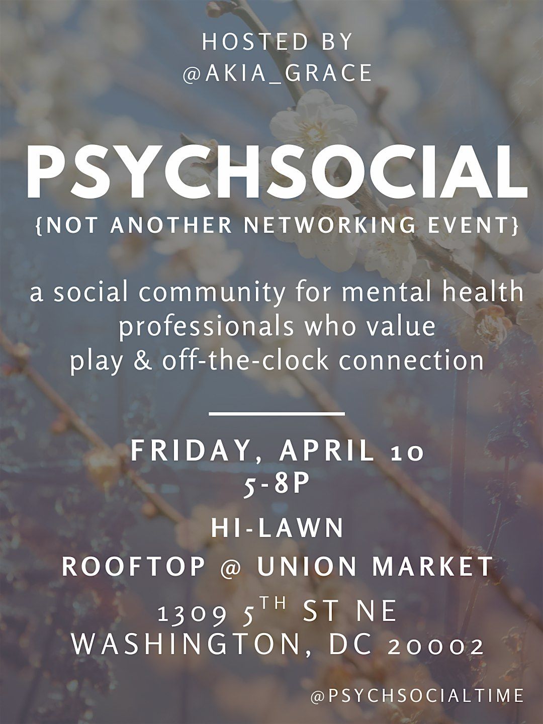 Heyy there! I’m akia grace and I host PsychSocial, a social gathering for psychologists, therapists, social workers, counselors, and other mental health folx who value PLAY and COMMUNITY.