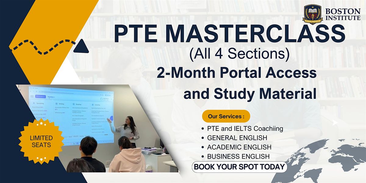 Ready to ace your PTE exam? Join our in-person masterclass covering all four sections with expert tips and tricks. Plus, get exclusive access to our portal for 2 months and comprehensive study material to boost your prep anytime, anywhere. Don’t miss out on this chance to level up your skills and conquer the test with confidence!