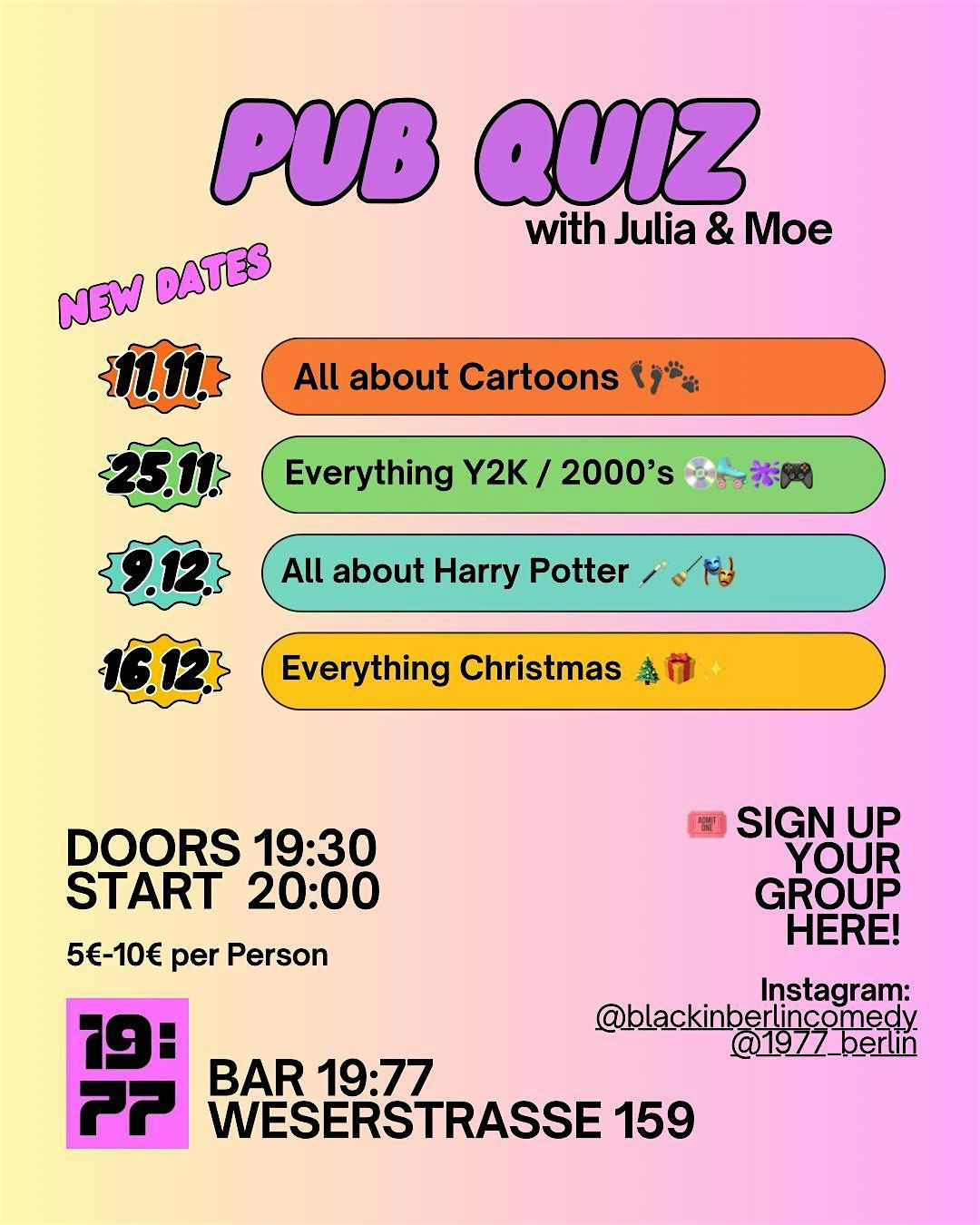 Our Pub Quiz hosted by Moe & Julia happens every 2nd Tuesday at the bar 19:77 on Weserstraße 159 at 8pm!