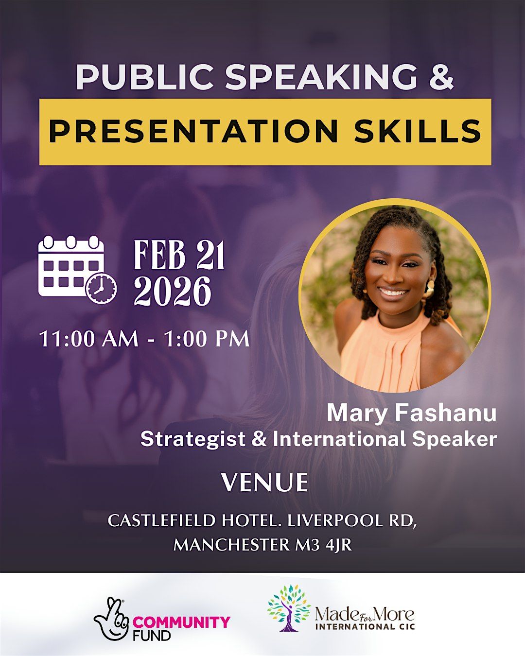 Facilitated by Mary Fashanu, an international speaker and strategist, this highly practical session will equip you with the tools to speak with impact, presence, and purpose — whether you are presenting in meetings, pitching ideas, leading teams, or speaking on stages.