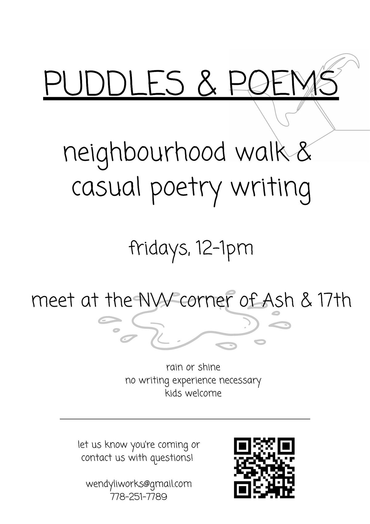 We will go on a short walk around the neighbourhood and then go indoors for a time of checking in, writing poetry, and reading our poetry aloud. Finger snapping encouraged!