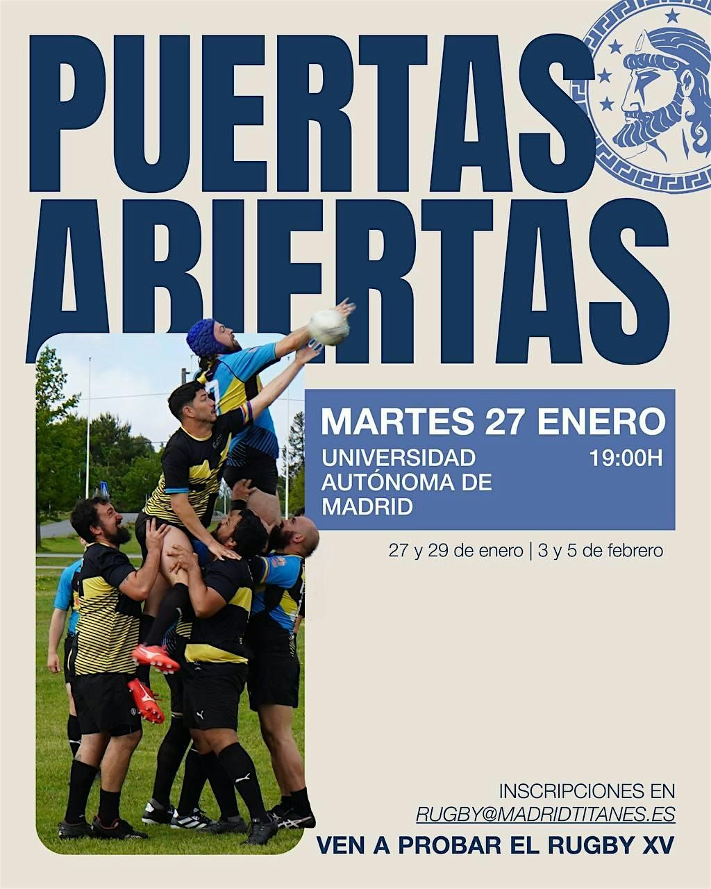 Madrid Titanes convoca una nueva jornada de puertas abiertas que tendrá lugar los días 27 y 29 de enero y 3 y 5 de febrero a las 19:00 horas en el campo de rugby de la Universidad Autónoma de Madrid.