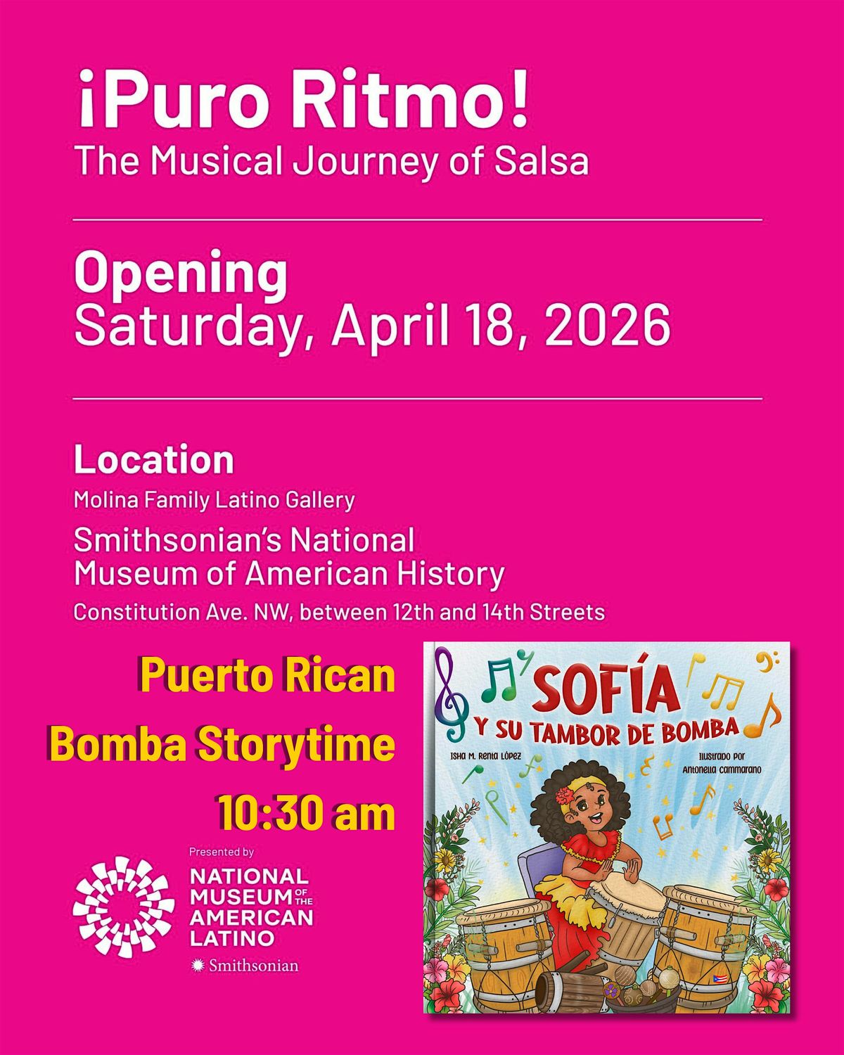Join us for a fun, interactive and bilingual book reading of Sofía y su Tambor de Bomba/Sofia and Her Bomba Drum at the Molina Family Latino Gallery, inside the National Museum of American History in Washington DC!