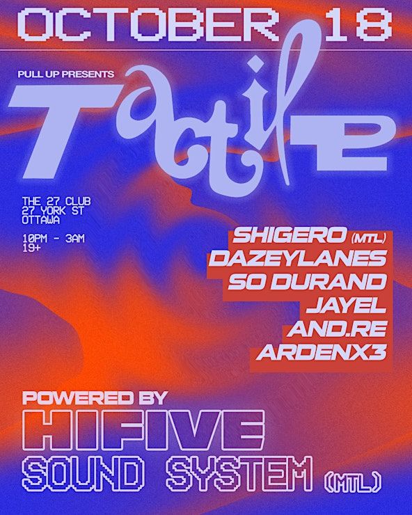 Joining us on October 18th is HIFIVE's own DJ/producer Shigero and Ottawa standouts: DazeyLanes, So Durand, Jayel, And.re and Ardenx3. Get ready to transcend with maximum vibrations as we takeover The 27 Club for the first edition of Tactile.