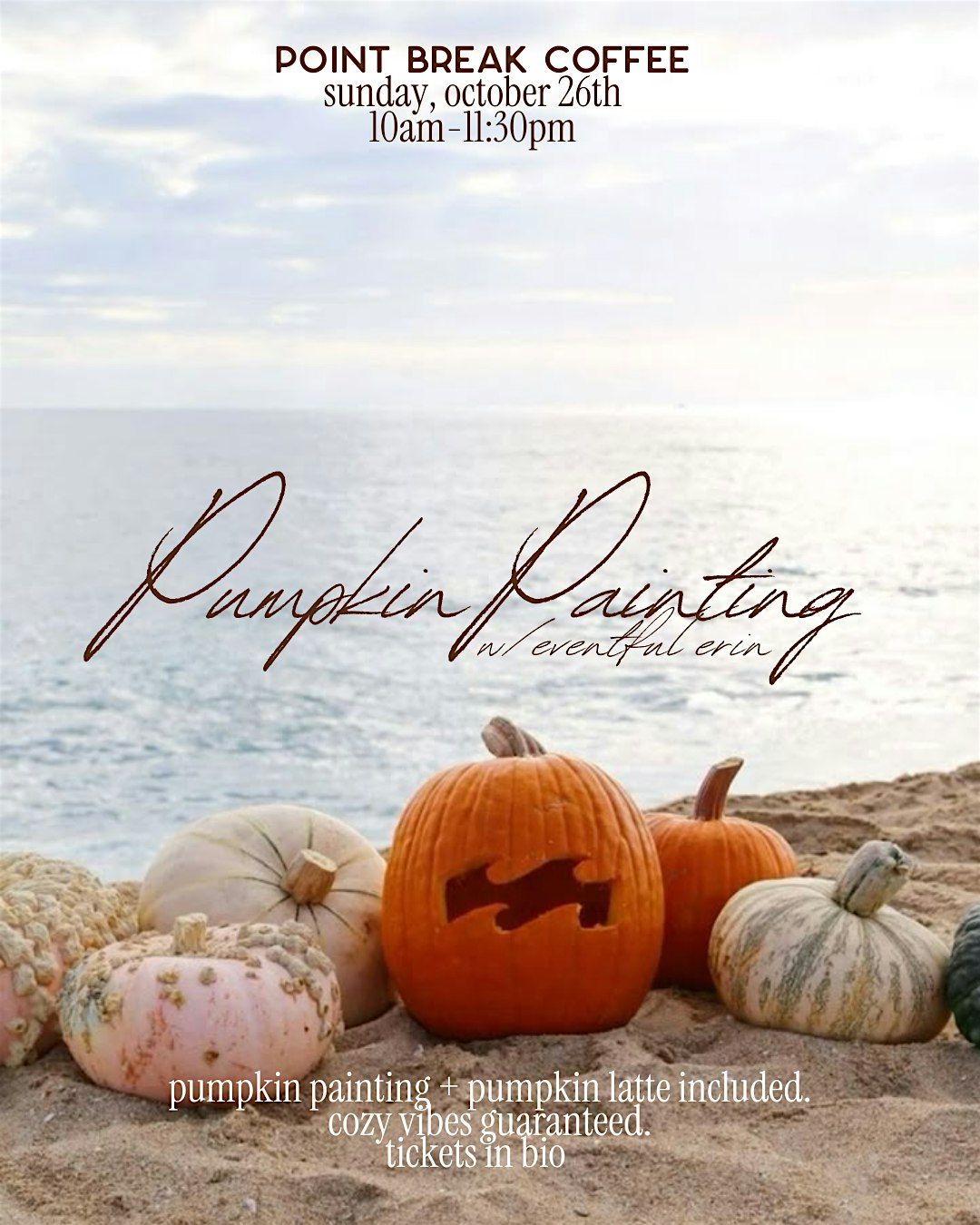 join us at point break coffee for a intimate pumpkin painting event set up by Eventful Erin! pumpkin latte & supplies included!