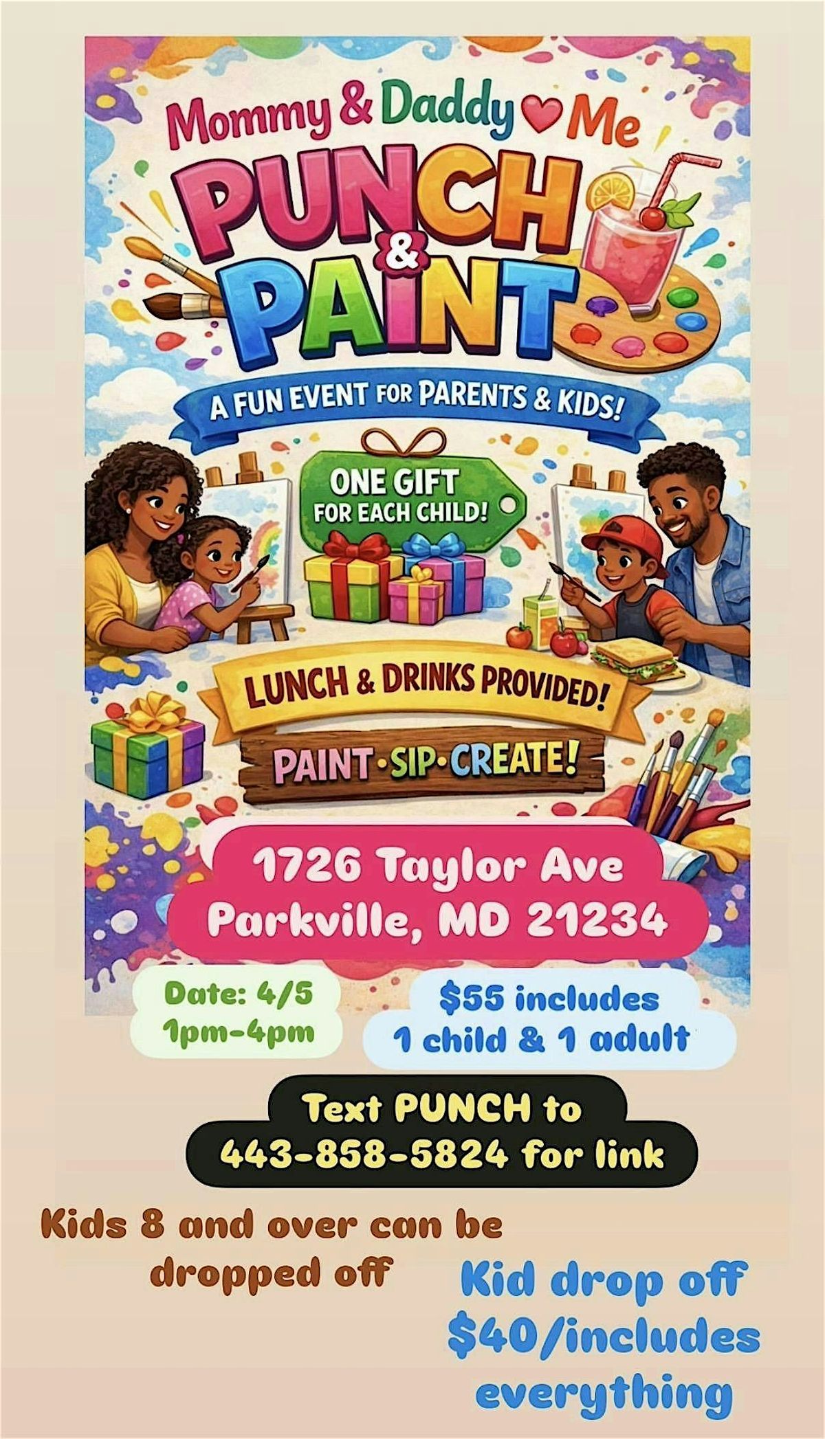 Get ready for a fun-filled day of creativity and connection! Punch & Paint with Mommy/Daddy is an awesome in-person event where you and your little one can sip on some delicious punch while painting your hearts out. No stress, just laughs, colors, and making memories together. Perfect for all skill levels – no artistic experience needed!