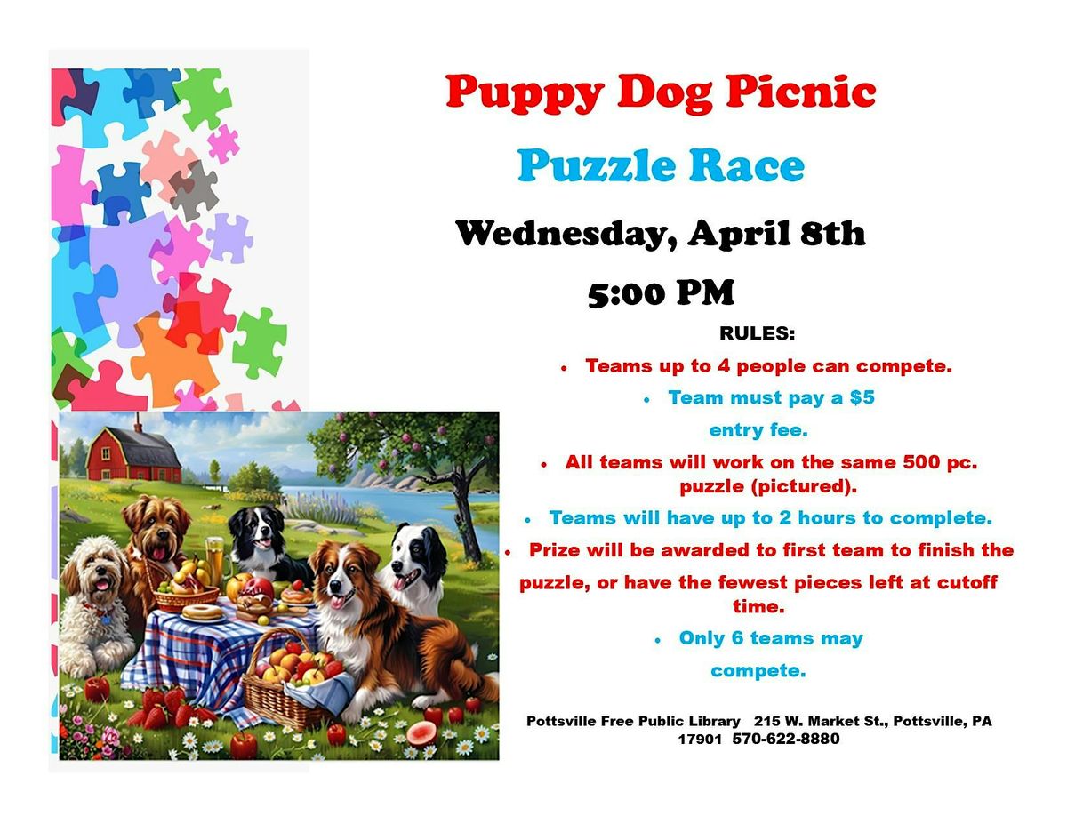 Get ready for some competitive family fun! Teams up to 4 people are invited to join us in racing to the finish line to complete the Puppy Dog Picnic 500 piece puzzle! Winning team will win a prize. Teams must pay an entry fee of $5 per TEAM (not per person). Puzzle Race will be held on Wednesday, April 8th, at 5:00 PM.
