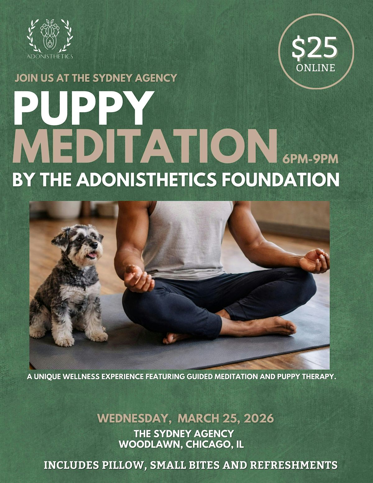 Join us for a unique and uplifting wellness experience hosted by The Adonisthetics Foundation. The Puppy Meditation Experience is designed to help guests slow down, reconnect with themselves, and experience the calming power of mindfulness alongside the joyful presence of puppies.