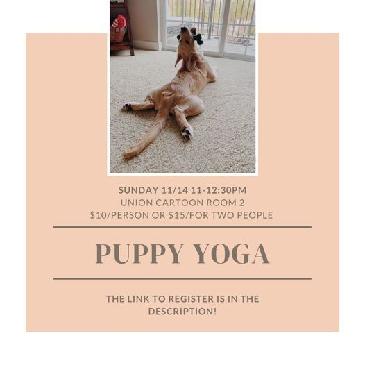 This Sunday (11/14) we are hosting Puppy Yoga from 11-12:30pm in the Union Cartoon Room 2! We haven't been able to host Puppy Yoga in two years, so we've got a lot of excited pups ready to show of their downward dog! All proceeds will go to our college program's service dogs in training and our goal to donate to a family hoping for a service dog.You can register for $10/person or $15 if you sign up two people at the same time!