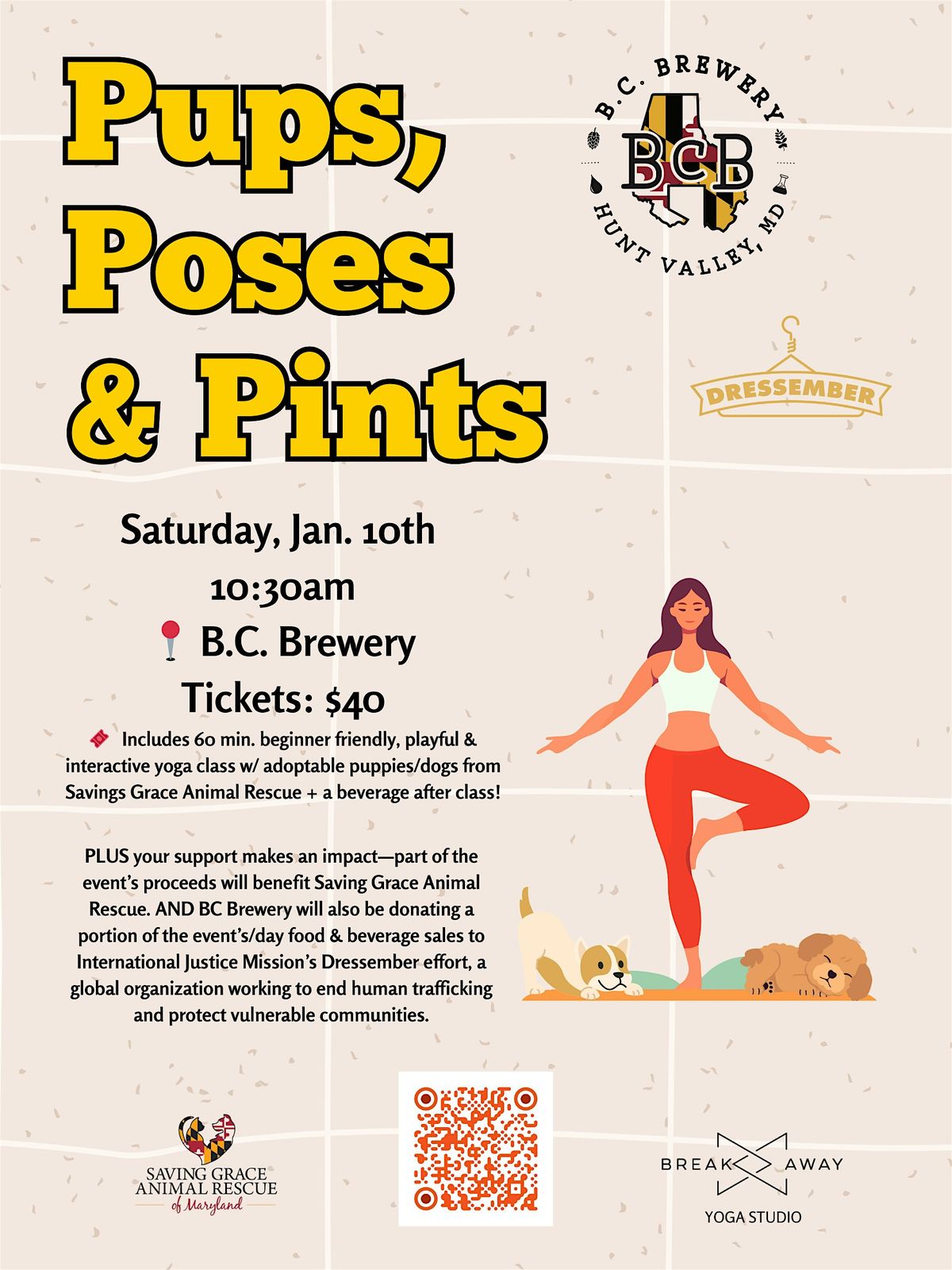 Join us for a beginner-friendly, 60-minute yoga flow with adoptable pups, where stretching and smiles come with a side of giving back. A portion of ticket sales will benefit Saving Grace Animal Rescue of Maryland, helping them continue to rescue and find loving forever homes for our furry "yoga partners".