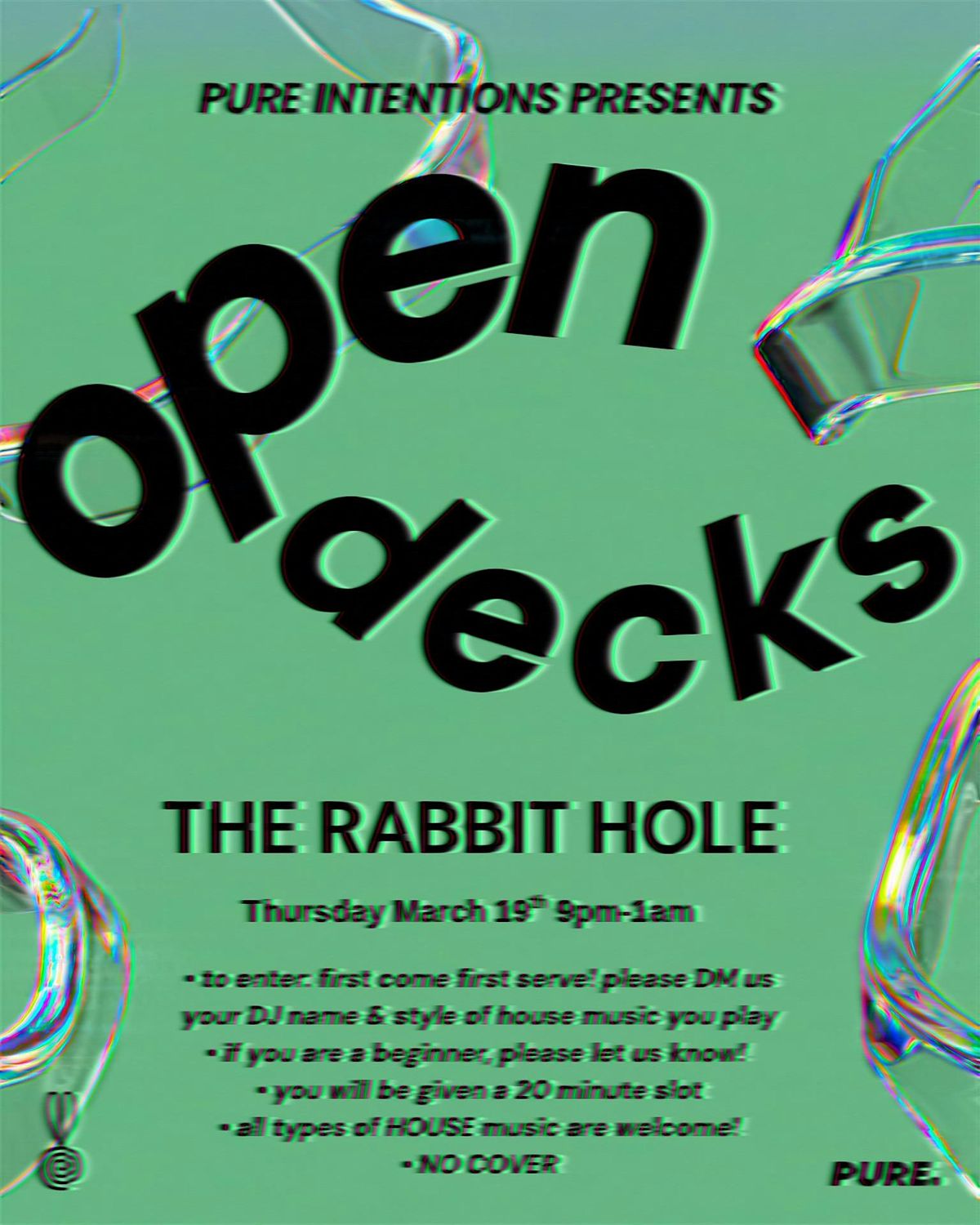 To enter: First come first serve? DM Pure Intentions on Instagram your DJ name & style of house music you play.