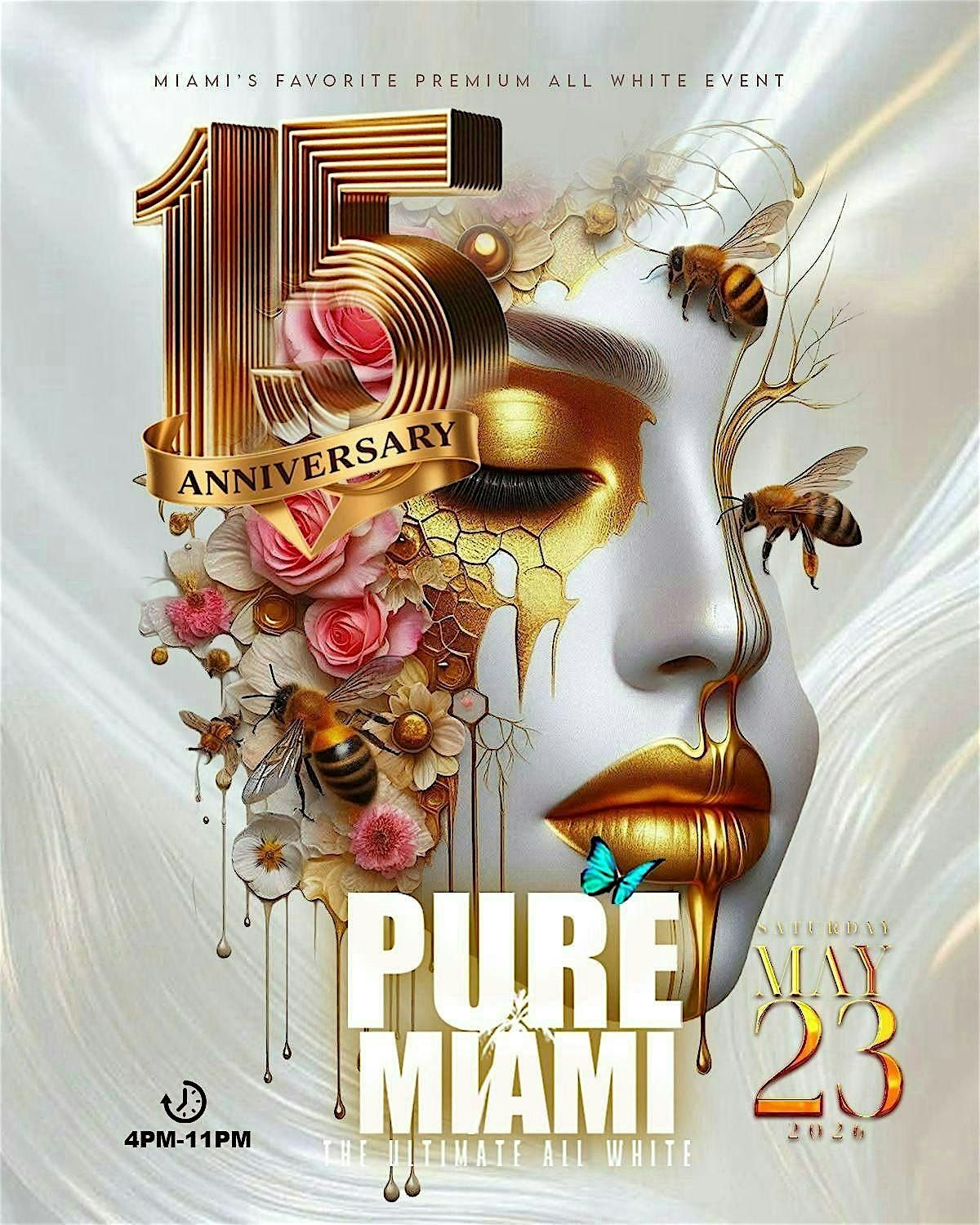 Welcome to the PURE MIAMI ULTIMATE ALL WHITE MEMORIAL WEEKEND 2026 event! Get ready to celebrate in style as we celebrate our 15th Anninversary on May 23, 2026 from 4 PM to 11 PM. It's going to be a night to remember filled with good vibes, great music, and amazing company. Don't miss out on this exclusive all-white affair! Dress to impress and come ready to make memories at the Ultimate All White Party. See you there!