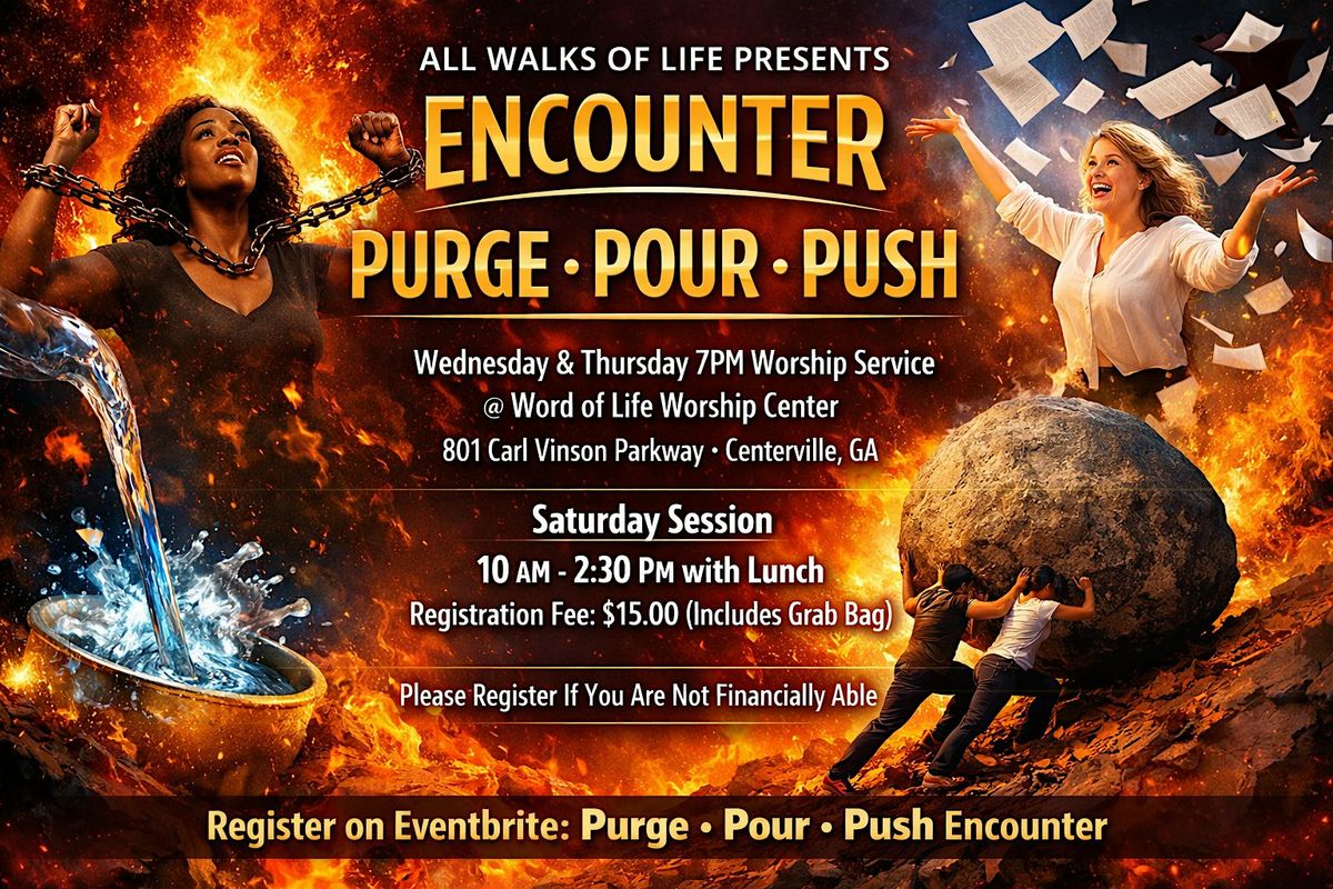 The Purge • Pour • Push Conference is a transformational gathering designed to help individuals release what no longer serves their purpose, receive fresh vision and spiritual renewal, and boldly move forward into their next season.