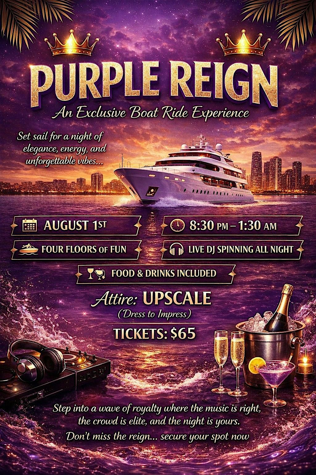 Purple Reign Boat Ride Aug 1, 8:30PM-1:30AM. $65 includes food & drinks. Upscale attire, DJ, 4 floors of nonstop vibes! 21+