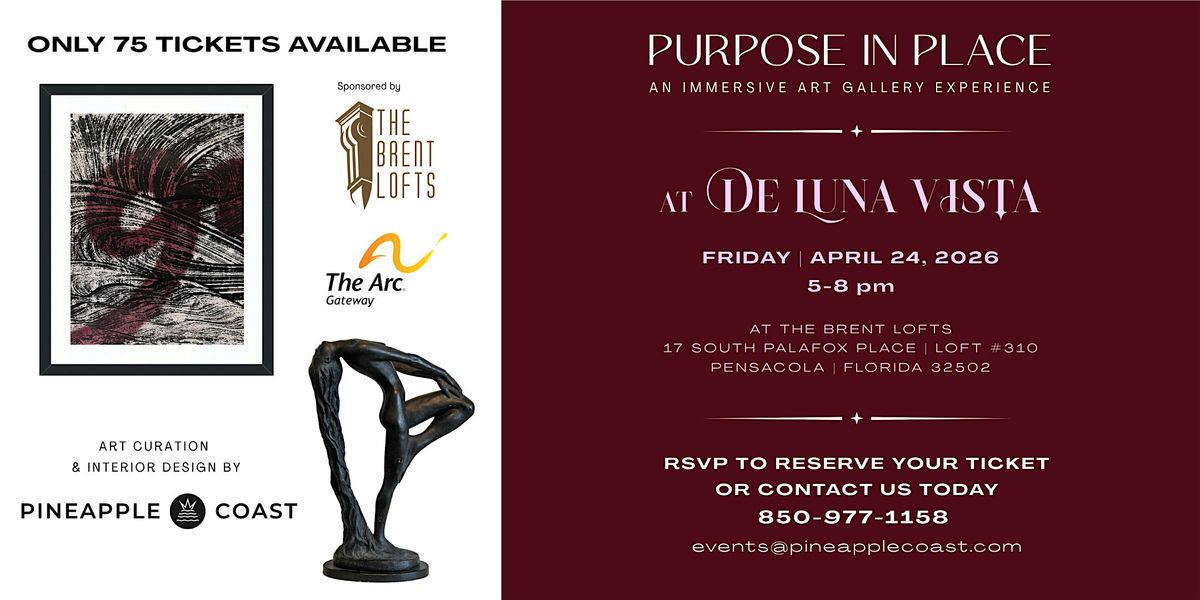 Welcome to PURPOSE IN PLACE at De Luna Vista at The Brent Lofts—a luxury downtown Pensacola nightly condo rental property transformed into an immersive art gallery experience happening at 17 South Palafox Place - Unit #310. Mark your calendar for April 24, 2026 at 5:00 PM (Central Time) and get ready for an unforgettable evening of art and new perspectives. Don’t miss out on this unique experience!