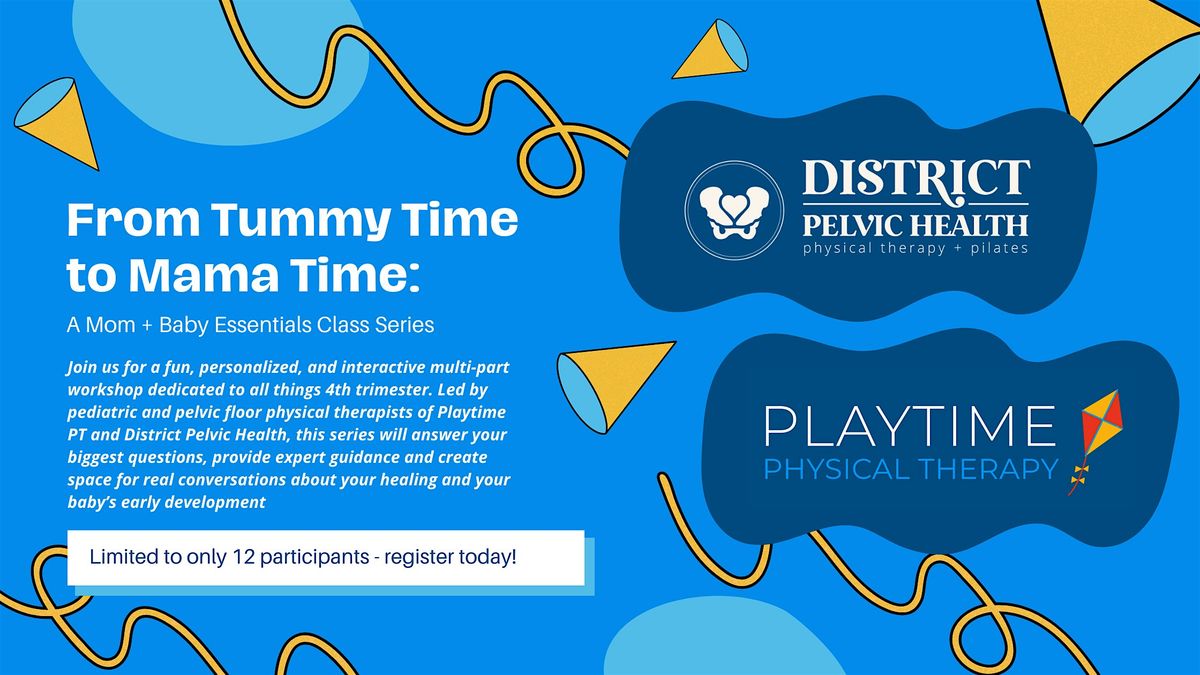 Join District Pelvic Health & Playtime PT for a fun, personalized, and interactive multi-part workshop dedicated to all things 4th trimester. We’ll answer your biggest questions, provide expert guidance and create space for real conversations about your healing and your baby’s early development. Every class will have useful information for both mom's recovery and baby's development. Let our experts guide you as you navigate this special journey into motherhood and connect with other Moms experiencing the same challenges and triumphs as you!