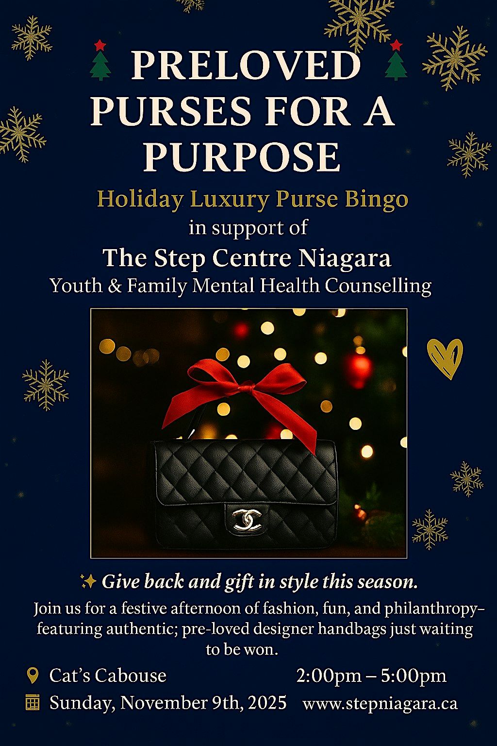 Come join us for a fun-filled afternoon of bingo where you can win fabulous purses just in time for the holidays! This in-person event is perfect for purse lovers and bingo enthusiasts alike. Get ready to dab those numbers and compete for stylish bags while supporting a great cause. Mark your calendars and bring your friends for a night of excitement and philanthropy! Proceeds go towards supporting the Step Centre Niagara. Free youth and family counselling services, youth cooking classes, and young moms support group .