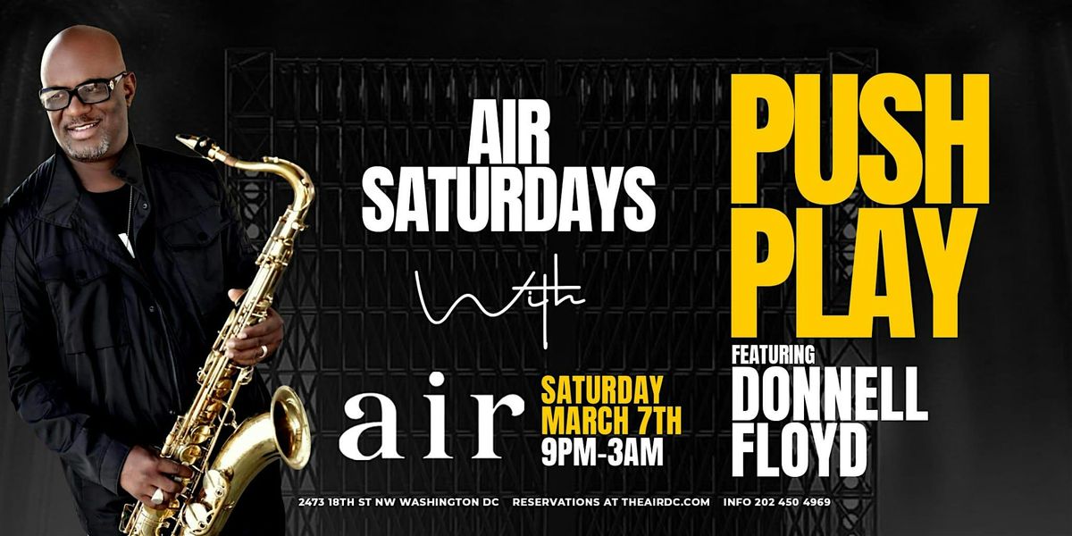 Welcome to Push Play ft Donnell Floyd Performing Live at Air DC! Get ready for a night of incredible music at Air Restaurant & Lounge. Join us for a live performance by the talented Donnell Floyd as he takes the stage to entertain and amaze the crowd. Don't miss out on this amazing event - mark your calendars and get ready to push play on a night to remember!