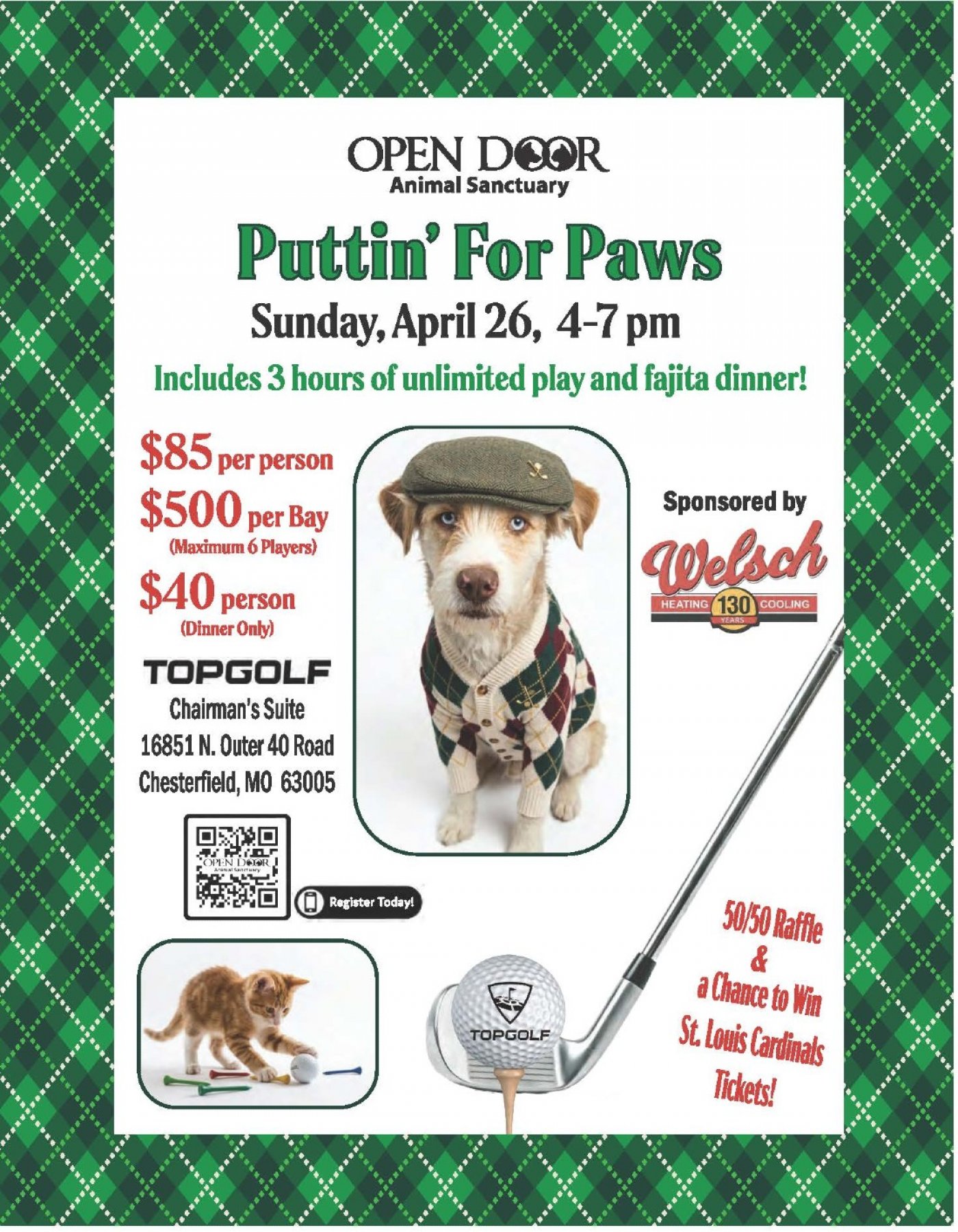 Join Us for a TopGolf Fundraiser in Support of Open Door Animal Sanctuary, sponored by Welsch Heating & Cooling!