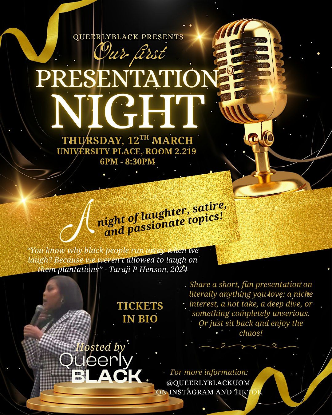 Join us at University Place, Room 2.219 for a night of laughter, satire, and passionate topics on March 12, 2026 at 6:00 PM (GMT). Share a short, fun presentation on literally anything you love: a niche interest, a hot take, a deep dive, or something completely unserious. Or just sit back and enjoy the chaos!
