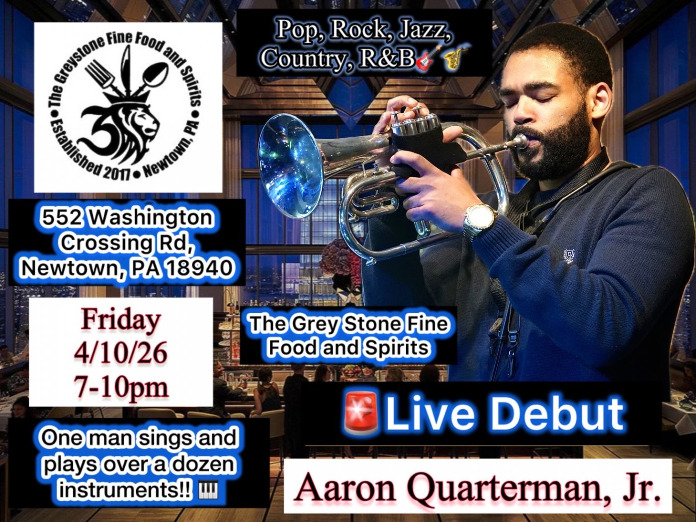 π€ πΆ Friday 4/10/26 7-10pm enjoy great food, drinks and music during my live debut at The Grey Stone Fine Food and Spirits! I will be putting on a one of a kind solo show like no other in this area! Singing and playing over a dozen instruments in one show! Music being a wide variety of Pop, Rock, Jazz, Country and R&B Favorites! πΉπ₯π΅πΊπ»πΈπ·